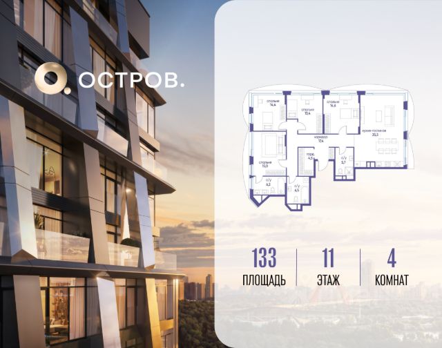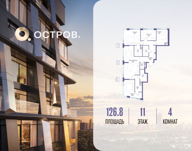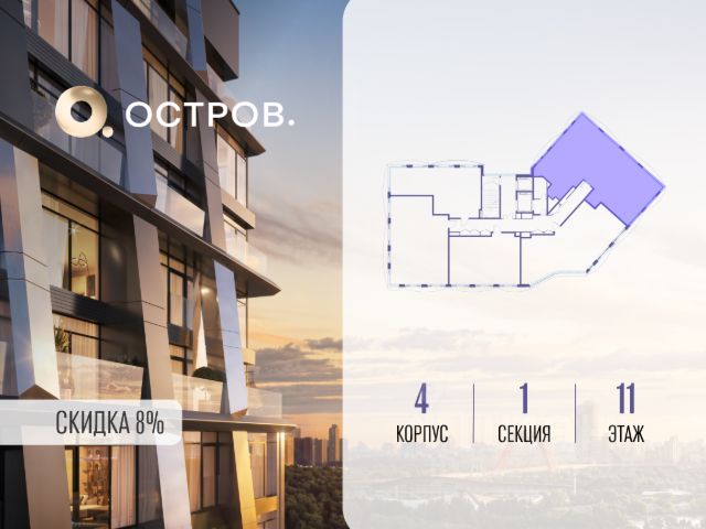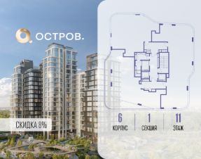 Остров1, общей площадью 42,8 кв. м, расположена в 5 корпусе на 11 этаже.