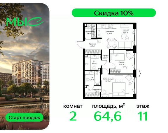 Прямая продажа от застройщика. Продаётся 2-комнатная квартира общей площадью 65.92 м² без отделки в премиальном жилом комплексе "МЫС" на 11-м этаже 12 этажного дома. Квартира расположена в корпусе "Волга". Проект МЫС — это, прежде всего, идеальное место для семей. В рамках проекта построят государственную школу, два детских сада и дворец спорта площадью 20 000 м2 с термальным комплексом, выплывным бассейном, фитнес-залом, теннисными, сквош и падел кортами и секциями для детей. На территории площадью, сравнимой с тремя парками Зарядье, появятся кафе и рестораны, пруд с набережной, спортивные и детские площадки, скейт-парк, лыжные и веломаршруты. Расположение: - 2 минуты до скоростной трассы М1 и Минского шоссе; - 10 минут до МКАД; - 15 минут до МЦД Лесной Городок - 20 минут до делового центра "Москва-Сити"; - 28 минут до аэропорта "Внуково". Благоустройство: - велосипедные и лыжные маршруты; - собственная набережная и парк; - лаунж-зоны в окружении природы; - беседки у очага; - дворец спорта площадью 20 000 м²; - термальный комплекс с тремя бассейнами; - 4 теннисных и падел-корта; - 6 сквош-кортов; - многофункциональный спортзал; - скейт-парк; - просторная площадь для прогулок с фонтаном; - детский клуб с творческими секциями; - гастро-доминанта; - кафе у пруда, рестораны, ритейл. Окружение - соседство с лесным фондом; - школа на 1250 мест и 2 детских сада на 350 и 255 мест; - Дубковский и Подушкинский леса, парк "Рассказовка", Мещерский парк. Действуют специальные условия при 100% оплате, подробности уточняйте у менеджера в офисе продаж.