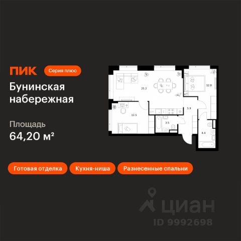 Продаётся 3-комн. квартира площадью 75,1 кв.м на 11 этаже 16 этажного дома (Корпус 2.6/1.4, Секция 4) проекта ПИК Бунинская набережная. Светлый просторный подъезд на уровне земли, функциональная планировка, большие окна, c отделкой. Удобное расположение: 18 минут пешком от м. "Потапово" и 12 минут на автомобиле до станции "Бунинская аллея". 12 минут на автомобиле до трассы Солнцево — Бутово — Варшавское шоссе. 20 минут на автомобиле до МКАД и Калужского шоссе. 1520 минут езды до живописных парков: "Бутовский лесопарк", заказник "Южное Бутово". Особенности проекта Камерный квартал в Новой Москве, на берегу Ивановского пруда. Одна из ключевых особенностей проекта — квартиры с панорамным видом на воду. Архитекторы вдохновились локацией проекта: природные оттенки и активная пластика корпусов напоминают рельефные выступы на берегу, а окна отражают водную гладь, визуально объединяя дома с природой. Преимущества проекта Светлые и просторные лобби с зонами ожидания. Подземный паркинг. Набережная и пешеходная аллея для прогулок. Парк на склоне с игровой зоной. Готовая инфраструктура района: 3 школы, 6 детских садов, взрослая и детская поликлиники. Артикул 969101 (Застройщик ООО СЗ "Стройком")