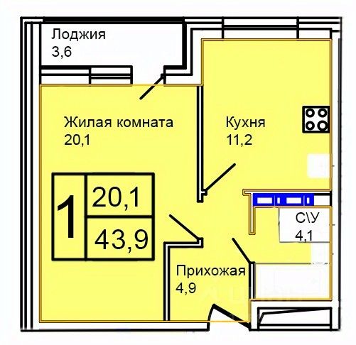Продаётся 1-комнатная квартира в строящемся доме (Корпус 1), срок сдачи: IV-кв. 2027, общей площадью 43.9 кв.м., на 11 этаже.