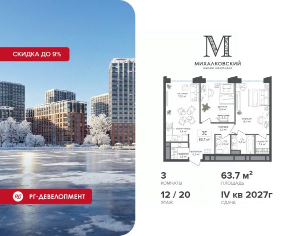 Скидка 9% при покупке квартиры! Продаётся 3-к квартира 58,6 кв.м. в ЖК "Михалковский" на 12-м этаже 20 этажного дома. Ипотека для каждого! Полная стоимость кредита от 13,192% до 17,149%. Ставка от 0,11% в АО "Альфа-Банк", ген. лицензия ЦБ РФ 1326 от 16.01.2015. Ставка фиксируется на первые 12 месяцев, далее полная стоимость кредита от 22,022% до 24,599% ставка 21,59%. Первоначальный взнос — от 20,1% от стоимости квартиры. Срок кредитования — от 4 до 30 лет. Компания "РГ-Девелопмент" предоставляет скидку на квартиры в жилом комплексе. Акция действительна до 15.03.2026 включительно. Для того чтобы воспользоваться предложением, необходимо подписать договор на приобретение недвижимости до 15.03.2026 включительно. Действует программа "Растет семья - растет и квартира". Компания "РГ-Девелопмент" вошла в ТОП-10 девелоперов по объёму введённого жилья в "Старой Москве" по итогам 2025 года. Прямая продажа от застройщика! Квартиры без отделки. Срок сдачи IV кв. 2027г. Особенности проекта: Завораживающие виды Красивое благоустройство Уникальная локация для Москвы (рядом Головинский парк, пруды, усадьба Михалково) Рядом с центром В проекте присутствует: архитектура голландского бюро MLA+, зеленые зоны, транспортная доступность, благоустроенная территория, подземный паркинг, детский сад и выход на Головинский парк с пятью прудами. Название комплекса указывает на одну из его черт - соседство с имением Михалково. Позвольте себе жить в месте, где проводили свой досуг династии Дашковых и Паниных.