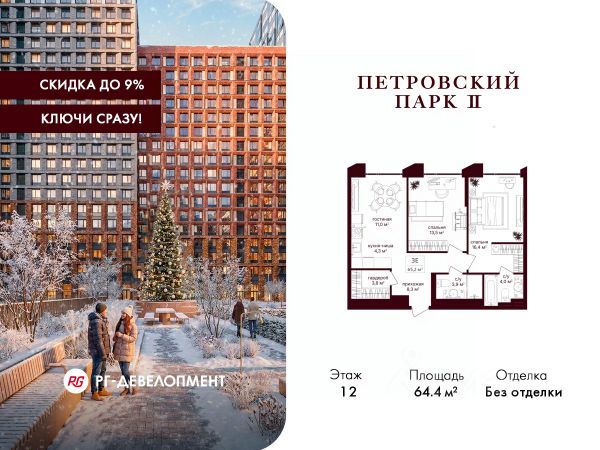 Рассрочка 0%. Первый платёж 30%, второй - не позднее 31.12.2026 г. Продаётся 1-комнатная квартира 51.7 кв.м. в ЖК "Петровский парк II" на 12-м этаже 25 этажного дома. ЖК "Петровский парк II" — жилой комплекс в Савёловском районе, где город ощущается иначе. Здесь история и масштаб Москвы не давят, а задают фон для спокойной, уверенной жизни рядом с центром. Это место, где статус читается не в громких формулировках, а в окружении, архитектуре и ощущении пространства. Коротко о важном: • Район с глубоким историческим контекстом и парковым окружением; • 5 минут пешком до метро "Динамо", рядом с деловой и культурной жизнью города; • Редкое сочетание: энергия мегаполиса и тишина зелёных аллей; • Архитектура от бюро Syntaxis с пластикой форм и индивидуальным характером фасадов; • Панорамные виды на город и зелёные массивы Петровского и Тимирязевского парков; • Закрытый двор без машин, вдохновлённый эстетикой дворцовых садов; • Просторные гранд-лобби с высокими потолками и выверенной, респектабельной эстетикой; • Частный детский сад во дворе; • Подземный паркинг и кладовые; • РГ-Девелопмент - ТОП-20 крупнейших застройщиков Москвы. Расположение комплекса формирует особое ощущение свободы выбора. Утром - прогулка по тенистым аллеям Петровского парка, днём - работа и встречи в деловых кластерах поблизости, вечером - культурные события, рестораны и городские пространства в нескольких минутах пути. Здесь расстояния измеряются не километрами, а шагами от дома. Архитектура "Петровского парка II" задумана как современная доминанта района и одновременно как уважительный диалог с исторической средой. Асимметричные объёмы, волнообразные элементы и игра света и тени создают выразительный, но сдержанный силуэт. Архитектура наполнена воздухом и визуальным ритмом, оставаясь спокойной и уверенной. Общественные пространства продолжают эту логику. Два гранд-лобби с высокими потолками и благородной цветовой палитрой воспринимаются как пространства, где хочется замедлиться: встретить гостей, перевести дыхание после дня или просто почувствовать уровень среды, в которой вы живёте. Внутренний двор комплекса - это отдельный мир, закрытый от машин и городского шума. Ландшафтный дизайн отсылает к регулярным дворцовым садам: геометрия аллей, зелёные "кабинеты", цветники и камерные зоны отдыха создают разные сценарии для повседневной жизни. Здесь органично соседствуют детские игровые пространства, плейхаб, спортивные зоны и тихие места для отдыха. На территории комплекса расположены магазины, кафе и рестораны, а также частный детский сад, встроенный в общую структуру двора. Подземный паркинг и кладовые поддерживают ощущение порядка и цельности пространства.