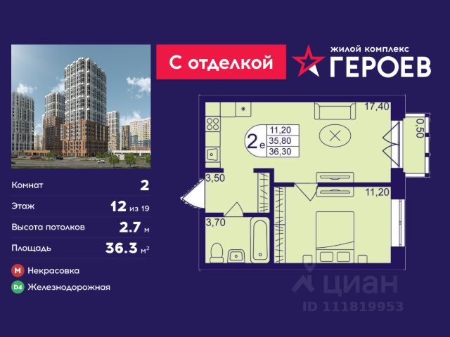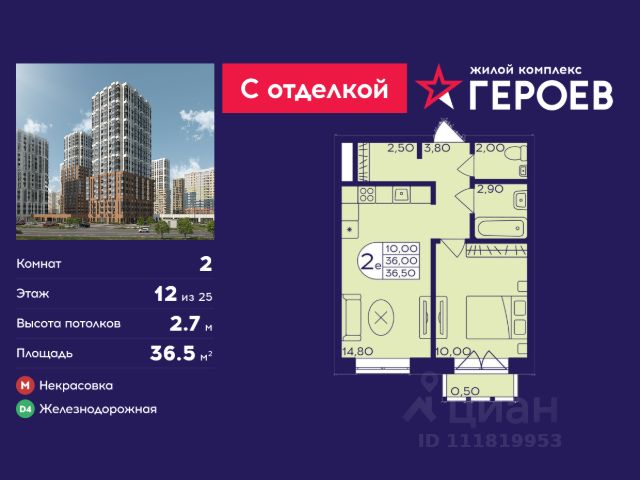 Продаётся 2-комнатная квартира 36.5 кв. м. в жилом комплексе "Героев" в Балашихе, Железнодорожный. Квартира расположена на 12 этаже 611 корпуса. Все квартиры представлены с чистовой отделкой. Вам не нужно тратить время и дополнительные финансы на ремонт или жить в шуме строительных работ - достаточно перевести свои вещи, расставить мебель и всё готово! Жилой квартал "Героев" - это уютный проект для семей с детьми. Всего 40 минут до центра Москвы. В квартале созданы все условия для досуга всех возрастов: игровые и спортивные площадки, места для отдыха и прогулок, магазины, кафе и пункты выдачи. За 15 минут можно дойти от дома до Ольгинского лесопарка - популярного места для прогулок и отдыха на свежем воздухе. Здесь приятно гулять всей семьёй, заниматься спортом или устроить пикник в выходной день. Преимущества: Квартира с готовой отделкой. Пространство полностью подготовлено для жизни: не нужно тратить время и деньги на ремонт или ждать его окончания. После получения ключей достаточно расставить мебель - и можно сразу заезжать и жить. Продуманные и светлые планировки. Просторные кухни-гостиные создают комфортное пространство для отдыха и встреч с близкими. В квартирах предусмотрены удобные гардеробные, благодаря чему легко поддерживать порядок и не перегружать комнаты шкафами. Увеличенное остекление. Большие окна наполняют квартиру естественным светом в течение всего дня, создавая ощущение простора и уюта, а также визуально расширяя пространство и делая интерьер более воздушным. Пешая доступность до станции Железнодорожная (МЦД-4) - дорога займёт не более 30 минут до центра Москвы: станции метро "Курская", "Площадь Ильича" или ТПУ Нижегородская.