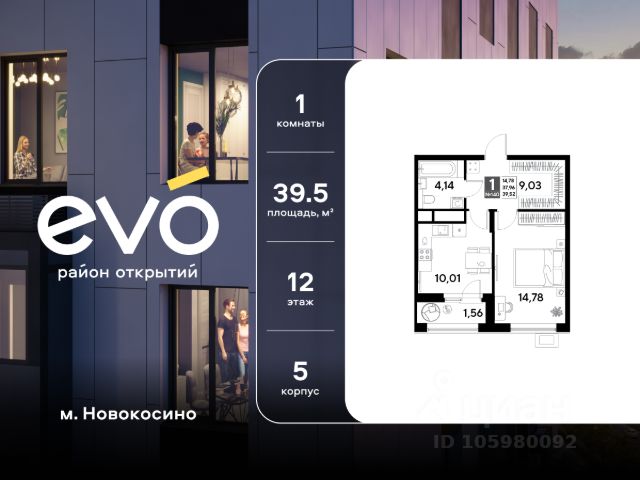 Продается однокомнатная квартира 39.52 кв.м. в жилом комплексе EVO на 12 этаже по адресу: Московская область, г. Реутов, ул. Комсомольская. Скидка 10% при полной оплате!* EVO - проект комфорт-класса от девелопера Dogma. Каждый житель сможет открыть для себя максимум возможностей. Совершенствоваться во всех направлениях: физическом, эмоциональном и материальном. В EVO можно открыть для себя новые виды спорта, найти единомышленников по хобби, партнеров по бизнесу, развивать в детях новые грани, наслаждаться природой и лаконичной архитектурой. Более 6 га благоустройства в первой очереди! - Зеленый двор без машин, кленовая аллея для прогулок. - Нейродинамические площадки для детей разных возрастов. - Workout зона, столы для пинг-понга, места для занятия йогой. велодорожки и дорожки для скандинавской ходьбы. - Детский сад на 180 мест и школа на 750 мест. - Кроссбукинг. - Лобби с зоной ожидания, колясочной и лапомойкой. - Магазины и кафе на первых этажах. БЕЗОПАСНОСТЬ - Закрытая территория. - Круглосуточное видеонаблюдение. - Контроль доступа. РАСПОЛОЖЕНИЕ Пешком - 7 минут до станции Реутов. - 20 минут до метро Новокосино. На машине - 4 минуты до МКАД. - 6 минут до шоссе Энтузиастов. - 9 минут до Носовихинское шоссе. - 13 минут до МСД (Московский скоростной диаметр). СОЦИАЛЬНАЯ ИНФРАСТРУКТУРА В первой очереди предусмотрено строительство детского сада на 180 мест и школы на 750 учащихся. В 10 минутах ходьбы от EVO находится детский технопарк "Изобретариум", в котором более 60 научных секции: от IT до промышленного дизайна. Для творческих ребят рядом есть художественная и музыкальные школы, хоровая студия. ОКРУЖЕНИЕ - Реутовский центральный парк, Александровский сквер, Фабричный пруд. - ТЦ "Экватор", ТК "Шоколад". - Спортивный комплекс "Старт", Ледовый комплекс "Реутов Арена". - Музей-усадьба "Кусково". *Подробности уточняйте по телефону.