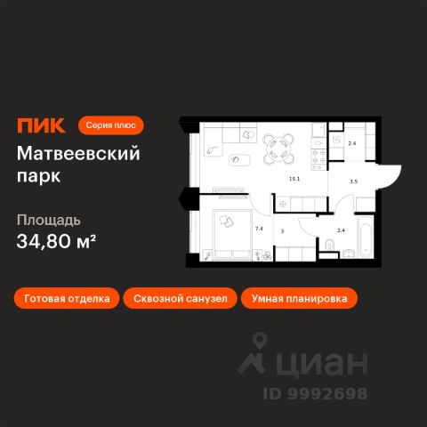 Цена указана с учётом скидки при 100%-й оплате, несубсидированной ипотеке, рассрочке (кроме программы "Рассрочка 0%"). В жилом квартале, расположенном на границе с природным заказником "Долина реки Очаковки", продаётся 2-комнатная квартира площадью 44.00 кв.м без отделки. Квартира расположена на 12 этаже 12-этажного корпуса 9 в жилом комплексе бизнес-класса Левел Мичуринский (компания Level Group/Левел групп). Отличная транспортная доступность: - от 10 мин. пешком до станции метро "Мичуринский проспект" - 15 мин. пешком до станции метро "Аминьевская" - 7 мин. на авто до МКАД - 10 мин. на авто до ТТК - 15 мин. на авто до Москва-Сити Продуманный архитектурный проект: - Выразительная архитектура от известных бюро: корпуса 1-6 - СПИЧ, корпуса 7-13 - Borisov Architects; - Из окон открываются живописные виды на парки, Москва-Сити и МГУ; - Высокие потолки до 6,35 м; - Стильные лобби с окнами в пол и высокими потолками до 4,7 м; - С каждого этажа дома на лифте можно спуститься в подземный отапливаемый паркинг. Расположение: Жилой комплекс Левел Мичуринский строится в одном из самых зелёных районов Москвы - Очаково-Матвеевское. Этот уголок столицы идеален для поддержания здорового образа жизни. В шаговой доступности от проекта находятся заказник "Долина реки Очаковки" - 1 мин. пешком и Очаковский парк - 7 мин. пешком. На велосипеде можно добраться до таких парков, как "Событие", парк Олимпийской деревни, парк 50-летия Октября и парк Школьников. В 15 минутах езды на авто расположено более 30 детских садов (из них 14 в пешей доступности), 32 школы (из них 13 в пешей доступности) и 14 вузов. Также в ближайшем окружении - более 25 медицинских учреждений, 11 спортивных клубов и 22 продуктовых супермаркета. Внутренняя инфраструктура: На территории жилого комплекса строится три детских сада и школа. На первых этажах домов откроется супермаркет, фитнес-центр, ресторан, кафе и другие сервисы. Подземные этажи займут паркинги: трёхуровневые - в этапах 1 и 2, одноуровневый - в этапах 3 и 4. Преимущества проекта: - 4,5 га благоустроенной территории с видовым мостом, уличным кинотеатром, зонами для тихого отдыха, работы, воркаута, площадки для петанка, футбола, настольного тенниса и пляжного волейбола. - Дизайнерские лобби с панорамным видом на двор, мойками для лап животных и комфортными зонами ожидания. - Безопасность жителей: круглосуточное видеонаблюдение всех зон общего пользования (лобби, лифты, паркинги, детские площадки), система контроля доступа, управление видеодомофоном через мобильное приложение, единый ключ доступа на территорию жилого комплекса. - Технологии и комфорт: высокоскоростной Wi-Fi в лобби и на придомовой территории, автоматическая система контроля и учёта ресурсов, абонентская связь с консьержем, распознавание номеров автомобилей при въезде в паркинг и выезде из него.
