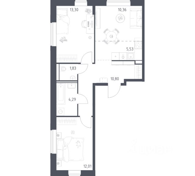 Предлагаем двухкомнатную квартиру с изолированными комнатами и большой кухней-гостиной.(евродвушка).