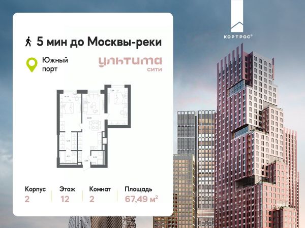 Предложение месяца от застройщика: - Скидка до 10% на ограниченный пул квартир - Рассрочка 0% на 1 год - Семейная ипотека без удорожания, ставка 4% - Ипотека для всех на весь срок, ставка 11,89% Продаётся 2-комнатная квартира от застройщика ГК "КОРТРОС" в жилом комплексе бизнес-класса УЛЬТИМА Сити. Квартира расположена на 12 этаже 52 этажного корпуса 2. Общая площадь 54,85 м². Без отделки. УЛЬТИМА Сити — жилой комплекс бизнес-класса в перспективном районе на юго-востоке Москвы. На его территории появятся 9 башен на 756 этажей, двухуровневый подземный паркинг, собственная инфраструктура, включая детский сад и школу. Всего девелопер благоустроит территорию в 2,6 га. Ближайшая станция метро — "Южный порт". Она откроется в 2028 году и будет находиться в 2-х минутах ходьбы. А прямо напротив расположится остановка водного автобуса-электрохода "Синичка". Дорога от квартала будет удобна и для автомобилистов: - до Кремля — 12 км - до МКАД — 12 км - до выезда на ТТК — 3 км - до Садового кольца — 8 км В двух корпусах первой очереди УЛЬТИМА Сити этажностью 45 и 52 реализуется 1 079 квартир с продуманными, рациональными планировочными решениями. В ассортиментной линейке представлены однокомнатные квартиры от 28,2 до 61 кв. м, двухкомнатные лоты от 44,3 до 95,4 кв. м, квартиры с тремя (71 — 115,57 кв. м) и четырьмя спальнями (106,6 — 114,97 кв. м). В экспозиции также есть квартиры с террасами, лоджиями, тремя и четырьмя санузлами, а также с функциональными нишами-кладовыми на кухнях. Запроектированы и эксклюзивные двухуровневые резиденции со вторым светом, в том числе с видом на Москву-реку, площадью от 77,7 до 141,9 кв. м. В рамках проекта запланировано строительство 9 корпусов, школы на 500 учащихся и детского сада на 225 мест. Еще будет создана продуманная инфраструктура для жителей: детские и спортивные площадки, амфитеатр для мероприятий, беседки и теплицы для садоводства, коворкинг, детский клуб и ресторан с открытой террасой. Доступ в жилой комплекс осуществляется по биометрическому контролю. Вокруг квартала будет приватная территория с видеонаблюдением и консьерж-сервисом 24/7. Лобби корпусов будут иметь двойные выходы: на улицу и во внутренний закрытый двор.
