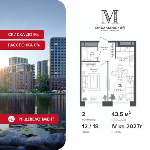 Ипотека для каждого! Полная стоимость кредита от 11,578% до 22,490%. Ставка от 0,11% в АО "Альфа-Банк" фиксируется на 1 год с даты заключения кредитного договора, далее полная стоимость кредита от 25,819% до 28,767% ставка 21,59% до окончания срока кредитования. Первоначальный взнос — от 20% от стоимости квартиры. Срок кредитования — от 3 до 30 лет. Скидка 9% при покупке квартиры! Продаётся 2-к квартира 43,5 кв.м. в ЖК "Михалковский" на 12-м этаже 18 этажного дома. Компания "РГ-Девелопмент" предоставляет скидки на квартиры в жилом комплексе. Акция действительна с 12.09.2024 г. до 30.11.25г. включительно. Для того чтобы воспользоваться предложением, необходимо подписать договор на приобретение недвижимости до 30.11.25г., включительно. Рассрочка 0% + Скидка 5%. При приобретении дольщиком квартиры в любом из двух данных корпусов с использованием способа оплаты "Рассрочка 0%", у покупателя также есть право воспользоваться скидкой в размере 5% от полной стоимости квартиры. Условия программы рассрочки: Первый платеж составляет 20% от стоимости объекта и вносится при заключении ДДУ. Второй платеж в размере 20% от стоимости объекта вносится по истечении 12 месяцев со дня подписания ДДУ. Оставшаяся сумма, в размере 60%, выплачивается за месяц до планового срока ввода ЖК в эксплуатацию, то есть не позднее 31.05.2027. Действует на приобретение квартир в корп. 2, 7. Действует программа "Растет семья - растет и квартира". Прямая продажа от застройщика! Старт продаж новых корпусов. Квартиры без отделки. Срок сдачи IV кв. 2027г. Особенности проекта: Завораживающие виды Красивое благоустройство Уникальная локация для Москвы (рядом Головинский парк, пруды, усадьба Михалково) Рядом с центром В проекте присутствует: архитектура голландского бюро MLA+, зеленые зоны, транспортная доступность, благоустроенная территория, подземный паркинг, детский сад и выход на Головинский парк с пятью прудами. Название комплекса указывает на одну из его черт - соседство с имением Михалково. Позвольте себе жить в месте, где проводили свой досуг династии Дашковых и Паниных.