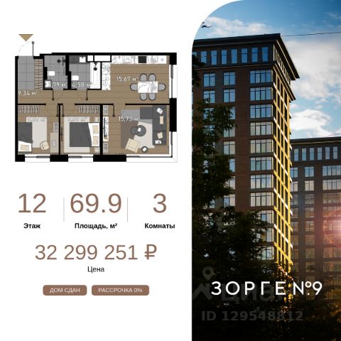 "Зорге 9" — готовые апартаменты бизнес-класса на Ходынке. 10 минут до Москва-Сити. Архитектура: 3 современных корпуса с фасадами в стиле архитектуры Нью-Йорка и с сервисами премиальных отелей, высотой до 23 этажа. Строгие линии, панорамные окна создают ощущение неподдельной роскоши и комфортной жизни в сердце мегаполиса. Проект награжден авторитетной премией European Property Awards. Резиденции: Свободная планировка, небольшая глубина этажа, огромные панорамные окна в пол до 3,6 м и высота потолков до от 3,3 до 4,3 м позволяют реализовать самые смелые концептуальные идеи и создать идеальный интерьер с учетом всех пожеланий. Вдохновляющие виды на город украсят ваш апартамент лучше любой картины. Есть возможность приобретения дизайн-проекта и полной меблировки апартаментов от партнеров девелопера. Расположение: 3 мин. пешком до парка Березовая роща 10 мин. пешком до Ходынского поля 10 мин. до ТЦ Авиапарк 30 минут до Шереметьево 10 мин до Москва-Сити или 1 станция до Москва-Сити 5 минут до ТТК 4 станции метро в шаговой доступности: 6 мин м. Полежаевская (фиолетовая ветка) 7 мин МЦК Зорге (МЦК) 7 мин м. Хорошевская (голубая ветка) 10 мин МЦК Хорошёво (МЦК) Благоустройство: Собственный парк 2 га с амфитеатром и поющими фонтанами. В парке высажено 136 деревьев и более 11 000 кустов и мелких растений из немецких питомников. Площадка для йоги и воркаут-зона со спортивными площадками. Теннисные столы и детский плейхаб Две башни Авторское гранд-лобби В лобби предусмотрена лаундж-зона, чайная с камином, комната для хранения велосипедов и колясок. Доступ по системе FACE ID. В отделке лобби и лифтовых холлов использован декоративный камень итальянского бренда Atlas Concorde Пентхаусы На верхнем уровне комплекса расположены роскошные просторные пентхаусы с высотой потолка до 4,2 метра и панорамными окнами до 3,6 метров, открывающими великолепные виды на столицу. Пентхаусы с выходами на собственные приватные террасы на кровле, площадью от 150 кв. м являются жильем high-уровня, демонстрирующим высокий статус владельца.