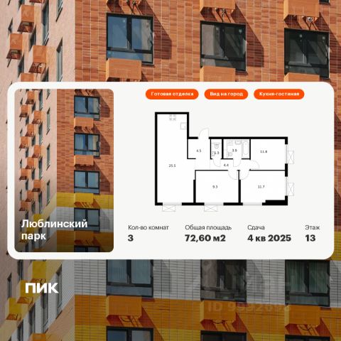 Продаётся 3-комн. квартира площадью 72,6 кв.м на 13 этаже 33 этажного дома (Корпус 14.1, Секция 1) проекта ПИК Люблинский парк. Светлый просторный подъезд на уровне земли, функциональная планировка, большие окна, c отделкой. Жилой квартал "Люблинский парк" расположен на юго-востоке Москвы, в шаговой доступности от станции "Братиславская". На метро до центра ехать всего 30 минут. Также недалеко станция МЦД "Перерва", от которой можно уехать в Москву или в область. В проекте 54 жилых корпуса, три школы, семь детских садов, поликлиника. В районе есть все условия для комфортной жизни: торговые центры, школы, детские сады, поликлиники и спортивные центры. Рядом находятся усадьба Люблино, скверы и парки. Различные магазины, кафе и другие сервисы откроются на первых этажах, а на подземных будут паркинги с удобной навигацией. В зелёных дворах без автомобилей мы построим детские площадки и места для отдыха. А ещё "Люблинский парк" стал третьим проектом ПИК с большой игровой площадкой PlayHub, которая уже открылась между 1-м и 2-м блоками на безопасном расстоянии от дороги. Новое детское пространство "Остров" воплощает идею бесконечной игры. Ландшафт площадки — это ещё и игровой элемент, который помогает детям придумывать множество самых разнообразных игр. Здесь интересно детям разного возраста — от малышей до подростков. Жителям квартала Люблинский парк и их друзьям доступен проект ПИКСПОРТ — это бесплатные занятия с профессиональными тренерами. Тренировки по разным направлениям, например йога, фитнес, бег, воркаут, проходят как в группе на улице рядом с домом, так и онлайн. Артикул 896011 (Застройщик ООО СЗ "Люблино Девелопмент")