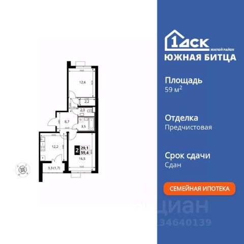 Прямая продажа от застройщика! Семейный жилой район класса Комфорт Плюс Продаётся 2-к квартира номер 484 общей площадью 59.4 кв.м. на 13-м этаже 22 этажного здания. Отделка Whitebox. Особенности квартиры: - Распашная планировка - отличное сочетание удобства и свободы. - Гостевой санузел - комфорт и удобство для ваших гостей. - Раздельный санузел - больше удобства для всех членов семьи. - Просторная кухня - место для семейных ужинов и кулинарных экспериментов. - Гардеробная - удобство для хранения и организации вещей. - Ниша под шкаф - компактное и удобное место для вещей. - Лоджия - уютное место для отдыха и тишины. Квартира с предчистовой отделкой (White box). Вам не придется заниматься черновыми и трудоёмкими работы, а чистовую отделку и дизайн - сделайте на свой вкус. Информация о комплексе: Сочетание свободного перемещения по внутреннней территории без машин и ощущения абсолютной безопасности благодаря надежным ограждениям - вот что отличает ЖК Южная Битца. На территории комплекса созданы все условия как для активного образа жизни, так и для спокойного времяпрепровождения. Свободно перемещайтесь по внутренней территории в безбарьерной среде! Продуманное зонирование во дворах позволяет отделить тихие зоны для родителей со спящими младенцами и тех, кто хочет почитать на свежем воздухе, от шумных игровых зон. Игровые зоны учитывают возраст детей. Площадки для детей старшего возраста вынесены за пределы дворов. Ощущение уютного дома должно начинаться с подъезда. Мы постарались предусмотреть все нюансы, чтобы наши лифты отвечали самым строгим современным требованиям. А наличие кладовых позволит вам поддерживать идеальный порядок и уют в вашей квартире! Транспортная доступность: В 3 км от МКАД в нескольких минутах езды до трех станций метро: Аннино, Бульвар Дмитрия Донского, улица Старокочаловская и станции МЦД2 - жд Бутово. Внутренняя инфраструктура: Для жителей жилого района "Южная Битца" доступна развитая инфраструктура близлежащих московских районов Чертаново, Южное, Бирюлёво Западное, Северное Бутово и Южное Бутово. Множество образовательных учреждений, объекты здравоохранения, торговые и развлекательные центры, кинотеатры, кафе, рестораны, парки.