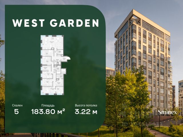 Комфортная и продуманная до мелочей 4-спальная квартира площадью 228.20 кв. м на 13 этаже в клубном доме 16. Увеличенная площадь окон и высота потолков 3.23 м дарят впечатляющие виды на парки, зеленые зоны и природные заказники. West Garden - это собрание клубных домов высотой 12-14 этажей в собственном парке 16 гектаров вдоль реки. Просторный среднеэтажный квартал расположен на Минской улице, в респектабельном Западном округе столицы. Вокруг премиальное окружение и более 1000 гектаров парков. West Garden - это возможность обеспечить себе и своей семье лучшие условия для жизни в одном из самых привлекательных и зелёных районов столицы. Гармония природы дополнена здесь впечатляющими возможностями и привилегиями: • Расположение в зелёном Западном районе столицы вблизи центра и ключевых магистралей в окружении парковых зон (заказник "Долина реки Сетунь", Мосфильмовский пруд, Ботанический сад МГУ, природный заказник "Воробьёвы Горы", Парк Победы на Поклонной горе) • Современная лаконичная архитектура, у каждого дома свой индивидуальный облик и выразительный фасад с использованием натуральных и долговечных материалов (гранит, известняк, клинкерный кирпич) • Функциональные лобби с отделкой из дерева и натурального камня с высокими потолками до 7,8 м • Самый большой собственный парк для прогулок и отдыха: 8 га собственной закрытой и благоустроенной территории, а также 8 га прилегающего парка на набережной с зонами отдыха с шезлонгами, маршрутами для бега, пеших и велосипедных прогулок • Инфраструктурный центр Clubhouse только для жителей: клубная гостиная с террасой и творческой атмосферой по фирменному стандарту Friend`s Lab, детская игровая зона 300 кв. м по стандарту Kid`s Lab • Насыщенная и разнообразная инфраструктура для детей любого возраста: 8 развивающих детских площадок в парке, 3 детские площадки на благоустроенной набережной, площадка для отдыха и досуга подростков • Спортивная инфраструктура по стандарту Fit Lab: многофункциональные площадки для футбола, баскетбола, волейбола с трибуной для болельщиков, зона воркаута, теннисные столы, зона для йоги, беговая дорожка 3 километра, фитнес-центр только для жителей • Комфортный и просторный подземный паркинг на 1313 машино-мест, 482 келлера, автомойка только для жителей на четыре поста