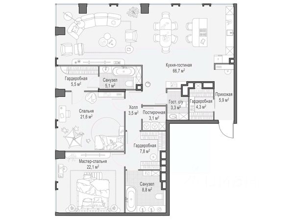 Просторная светлая квартира площадью 139,3 кв. м. Окна кухни-гостиной обращены в сторону Останкинской башни и исторического центра Москвы, а панорамное остекление улучшает видовые характеристики квартиры. Продуманная планировка позволяет разместить три спальни с отдельными санузлами и гардеробными. Окна квартиры выходят на восточную и северную стороны. Life Time - роскошный современный квартал на Пресне, в наиболее быстро растущем премиальном районе ЦАО. Его насыщенная инфраструктура и выгодное расположение дарят время для жизни. Вы больше не тратите его на дорогу или ожидание, при этом ни в чём себе не отказывая. На территории предусмотрено всё для комфортной жизни: • двор-парк площадью 1,8 гектара с прудом и фонтанами; • Clubhouse - инфраструктурный центр в отдельном здании с исчерпывающими возможностями для спорта, отдыха и досуга только для жителей; • спортивная инфраструктура на улице и в помещении, в том числе бассейн длиной 25 метров, хот-таб, хаммам, сауна, бьюти-зона; • клубная гостиная с террасой; • всё для развития и досуга детей любого возраста, в том числе детский сад и школа. Life Time находится в центре сложившегося премиального района, в окружении многочисленных парков. Удобная транспортная доступность и прямой выезд на Звенигородское шоссе позволяют без проблем добраться до Садового кольца и Москва-Сити. Архитектурный стиль квартала - роскошный минимализм. Дома десятилетиями будут выглядеть современно.