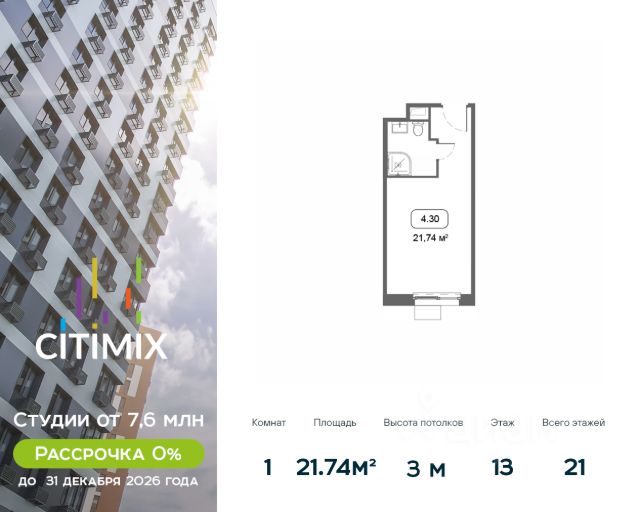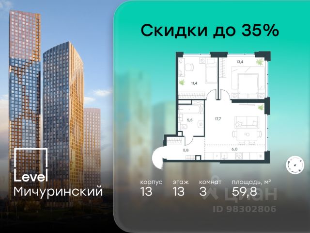 Цена указана с учётом скидки при 100%-й оплате, несубсидированной ипотеке, рассрочке (кроме программы "Рассрочка 0%"). В жилом квартале, расположенном на границе с природным заказником "Долина реки Очаковки", продаётся студия площадью 20.60 кв.м с отделкой white box. Квартира расположена на 13 этаже 24-этажного корпуса 11 в жилом комплексе бизнес-класса Level Мичуринский (компания Level Group/Левел групп). Отличная транспортная доступность - 10 мин. пешком до станции метро "Мичуринский проспект" - 15 мин. пешком до станции метро "Аминьевская" - 7 мин. на авто до МКАД - 10 мин. на авто до ТТК - 15 мин. на авто до Москва-Сити Продуманный архитектурный проект - Выразительная архитектура от известных бюро: корпуса 1-6 - СПИЧ, корпуса 7-13 - Borisov Architects; - Из окон открываются живописные виды на парки, Москва-Сити и МГУ; - Высокие потолки до 6,35 м; - Стильные лобби с окнами в пол и высокими потолками до 4,7 м; - С каждого этажа дома на лифте можно спуститься в подземный отапливаемый паркинг. Расположение Level Мичуринский строится в одном из самых зеленых районов Москвы - Очаково-Матвеевское. Этот уголок столицы идеален для поддержания здорового образа жизни. В шаговой доступности от проекта находятся заказник "Долина реки Очаковки" - 1 мин. пешком и Очаковский парк - 7 мин. пешком. На велосипеде можно добраться до таких парков, как "Событие", парк Олимпийской деревни, парк 50-летия Октября и парк Школьников. В 15-минутной доступности на авто расположено более 30 детских садов (из них 14 в пешей доступности), 32 школы (из них 13 в пешей доступности) и 14 вузов. В ближайшем окружении работает более 25 медицинских учреждений, 11 спортивных клубов и 22 продуктовых супермаркета. Внутренняя инфраструктура На территории жилого комплекса строится три детских сада и школа. На первых этажах домов откроется супермаркет, фитнес-центр, ресторан, кафе и другие сервисы. Подземные этажи займут паркинги: трехуровневые в этапах 1 и 2, одноуровневый в этапах 3 и 4. Преимущества проекта - 4,5 га благоустроенной территории с видовым мостом, уличным кинотеатром, зонами для тихого отдыха, работы, воркаута, площадки для петанка, футбола, настольного тенниса и пляжного волейбола; - Дизайнерские лобби с панорамным видом на двор, мойками для лап животных и комфортными зонами ожидания. - Безопасность жителей: круглосуточное видеонаблюдение всех зон общего пользования (лобби, лифты, паркинги, детские площадки), система контроля доступа, управление видеодомофоном через мобильное приложение, единый ключ доступа на территорию жилого комплекса. - Технологии и комфорт: высокоскоростной Wi-Fi в лобби и на придомовой территории, автоматическая система контроля и учета ресурсов, абонентская связь с консьержем, распознавание номеров автомобилей при въезде/выезде в/из паркинга.