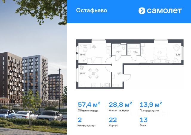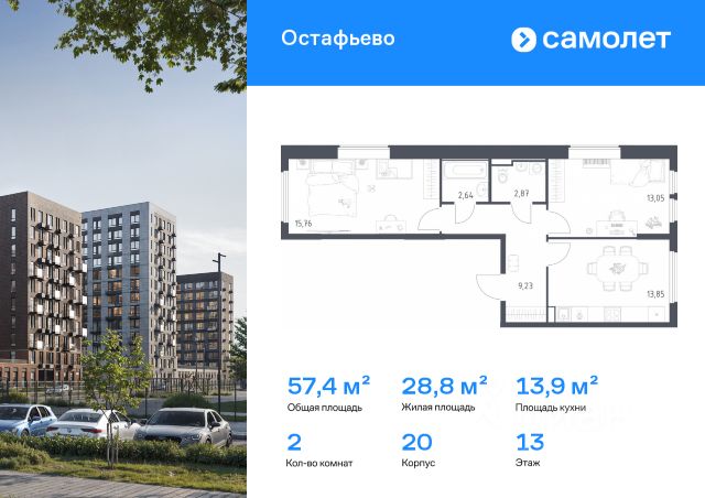 Строим кварталы для жизни с заботой о будущем. Предлагается 2-комнатная квартира комфорт-класса 57,4 кв.м в корпусе 20 на 13 этаже, в ЖК "Остафьево" Квартира с чистовой отделкой. Доступность дополнительных опций уточняйте у застройщика. Приобрести квартиру возможно по специальным акциям от застройщика, с текущими условиями акций можно ознакомиться в блоке "Акций". Цена динамическая и может отличаться, уточняйте актуальность у застройщика. "Остафьево" — масштабный жилой комплекс в Новой Москве, рядом с одноименным музеем-усадьбой и городским парком "Барыши". До станций МЦД "Щербинка" и "Остафьево" можно добраться на автомобиле за 57 минут. Часть домов уже сдана, на территории открыты две школы и три детских сада, а в будущем будет построена поликлиника, ТЦ, еще одна школа и три детских сада. Все необходимое рядом: на первых этажах домов работают магазины, аптеки и кафе. Дворы — приватные мини-парки без машин и посторонних. Кроме игровых площадок, для детей обустроили тематический плейхаб "Маяк". В будущем появятся плейхаб "Алиса в стране чудес", арт-объект "Тропа зеркал", а также большой ландшафтный парк. В квартале — монолитные дома комфортной высоты, от 10 этажей. Светлые фасады украшают кирпичные вставки в теплых природных оттенках.
