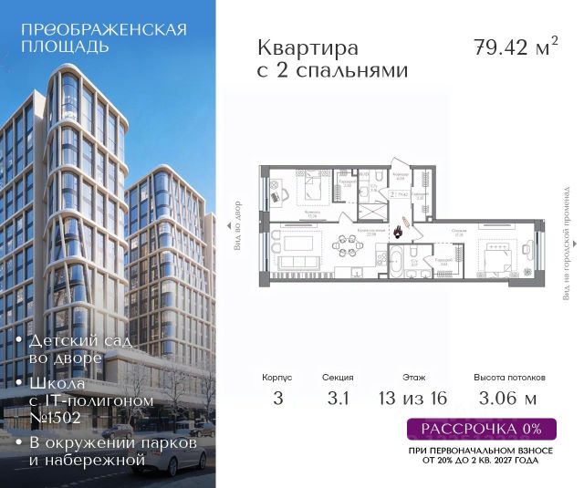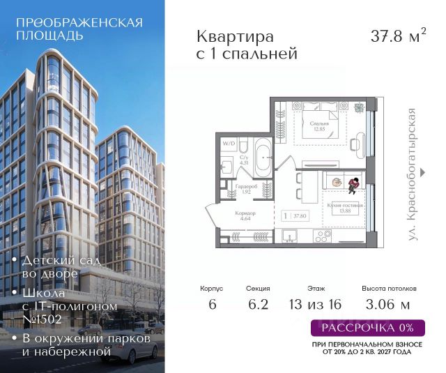 Квартира на 13 этаже в жилом комплексе премиум-класса "Преображенская площадь". Общая площадь: 37.8 кв.м. Проект премиум-класса в историческом районе Москвы. До метро "Преображенская площадь" 3 минуты пешком. Квартиры сдаются без отделки и в свободной планировке, чтобы жители могли оформить пространство с учетом своей индивидуальности. Высота потолков от 3,15м, широкоформатное остекление, 3-5 квартир на этаже. Система Умный дом. Дизайнерские лобби. Внутренний двор 1,5 га функциональное и безопасное пространство для игр, работы и занятий спортом. Пешеходный променад для прогулок. Дома переменной этажности. Есть подземный паркинг. Жилой комлекс находится в окружении парков Сокольники, Черкизовский, Измайловский, заповедника Лосиный остров и ВДНХ, а также вблизи пешеходной набережной. Комфортная удаленность от центра: 7 минут на автомобиле до ТТК, 8 минут до Садового кольца, 25 минут до Кремля.