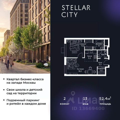 Продается квартира от надежного застройщика Tashir Estate в квартале бизнес-класса Stellar City в ЗАО Москвы. Площадь квартиры составляет: 47.2 кв. м, потолки: 3.1 м Квартира находится на 13 этаже, 4 корпуса жилого квартала Stellar City — микрогорода будущего на орбите Москвы. Stellar City — квартал в ЗАО Москвы вблизи инновационного центра Сколково. В окружении — 11 парков и природных зон, в том числе Долина реки Сетунь, Мещерский лес и парк развлечений The Rink. Город в городе Чтобы дом и инфраструктура вокруг отвечала динамичному лайфстайлу жителя мегаполиса, в основу проекта легла концепция город в городе, которая позволяет решать все бытовые вопросы in-home. В квартале будут возведены школа и детский сад, воркаут-зоны, променад, вело и беговые дорожки, детские площадки для каждого корпуса, а также коммерция на первых этажах для ежедневных покупок. Все необходимое — на расстоянии нескольких шагов. Изящные и лаконичные лобби Авторский дизайн, натуральные материалы в отделке и безупречный интерьер вне времени. Лобби и холлы в проекте бизнес-класса Stellar City ничем не отличаются от входных групп в премиум-сегменте благодаря качественным европейским материалам в отделке, стильному дизайну, консьерж-сервису и уютной зоне ожидания с журнальными столиками и мягкой мебелью. Комфорт и безопасность Закрытая территория, охрана, система СКУД, специально разработанное мобильное приложение дома для резидентов и подземный паркинг с круглосуточным наблюдением и доступом с помощью автоматического считывания номера авто.