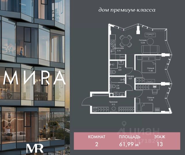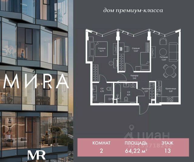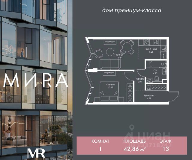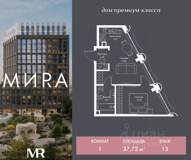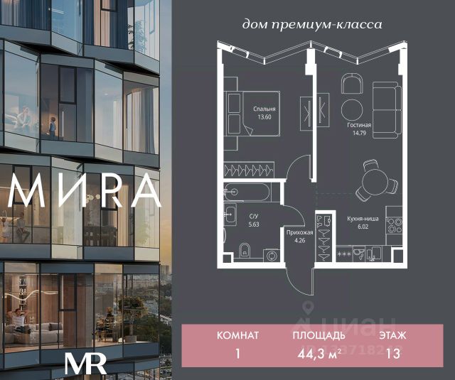 Прямая продажа от застройщика. Продаётся 1-комнатная квартира общей площадью 46.38 м² без отделки в доме премиум-класса МИRА на 13-м этаже 24 этажного дома. Квартира расположена в корпусе 3. Дом премиум-класса МИRA это: • Спокойный район с богатой историей и сложившейся инфраструктурой • Авторская архитектура на стыке классики и современности • Вход в парк прямо из жилого комплекса • Панорамные виды на Яузу, парки, ВДНХ и скульптуру "Рабочий и колхозница" • Удобные сервисы и безопасность для каждого резидента Расположение: Жилой квартал расположен в Алексеевском районе на северо-востоке Москвы, на второй линии домов, таким образом вы сможете дистанцироваться от шума и суеты проспекта Мира, но при этом будете жить недалеко от этой важной городской магистрали. Прямо у дома: • Парк Акведук • Река Яуза • Памятник "Рабочий и колхозница" Пешком: • 16 мин м. ВДНХ На автомобиле: • 12 мин ТТК • 15 мин Садовое кольцо • 12 мин Национальный парк "Лосиный остров" Благоустройство: Концепция благоустройства от бюро "ДРУЖБА" разработана в стиле "Лесная тропа". В уютном дворе расположились словно затерянные в лесу, площадки для отдыха. Они разделяются островками с травами, кустарниками, крупными камнями и деревьями, между которыми проходят узкие песчаные тропинки с деликатной подсветкой по вечерам. Центральной точкой притяжения для жителей станет главная площадь с фонтаном, которая открывается сразу из двух входных групп. Внутренний двор МИRA: • Детская площадка с зонами для игр малышей до трех лет и детей более старшего возраста • Спортивная площадка с профессиональным оборудованием для тренировок • Декоративные перголы • Воздушный арт-объект с подсветкой, похожий на облако • Чайный домик, где в отдельном отапливаемом павильоне можно в любое время года попить кофе с соседями или устроить камерное семейное чаепитие • Зоны для работы и отдыха с гамаком под навесом, скамейками и креслами Инфраструктура и окружение: В Алексеевском районе есть огромные благоустроенные парки, магазины, гимназии с высоким рейтингом и филиалы ВУЗов, частные и государственные детские сады, модные кофейни и фитнес-центры. В квартале МИRА предусмотрены: • 2 ресторана с видом на парк Акведук • 3 кафе • фитнес-студия • подземный паркинг на 330 машино-мест Компания MR Group предлагает своим клиентам специальные условия приобретения квартир в рамках программ ипотечного кредитования от банков-партнеров.