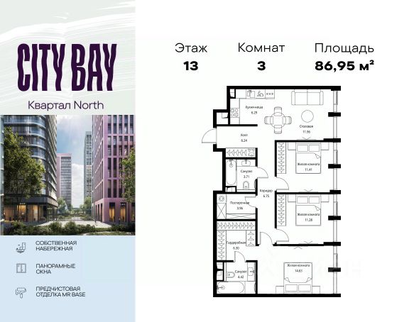 Прямая продажа от застройщика. Продаётся 3-комнатная квартира общей площадью 82.57 м² с предчистовой отделкой в ЖК City Вау, квартале Cliff, на 13-м этаже 15 этажного дома. Cliff by City Вау - это пять клубных домов на первой линии озелененной набережной Реки Москвы. Со стороны южного фасада, обращенного к воде, находится прогулочная зона, организующая входы в жилые секции. Вдоль северного фасада пятой очереди проходит общеквартальный озелененный бульвар с тематическими зонами и дворовыми территориями. В каждой секции предусмотрены сквозные входные группы, а между секциями - проходы для пешеходов, связывающие набережную и бульвар с местами для отдыха внутри квартала. Данное решение позволяет сделать комплекс с доступной и безбарьерной городской средой. Со стороны бульвара у каждой башни для жильцов комплекса расположены приватные потайные дворики, огороженные живой изгородью и интегрированные в общий ландшафт бульвара. Из-за перепадов высот по рельефу, уровень бульвара возвышается относительно уровня дворов, что делает их еще более камерными. Доступ на территорию со стороны бульвара осуществляется через калитку. В каждом здании комбинируется максимальное количество и разнообразие форматов квартир: от видовых квартир с зелеными террасами и лоджиями до квартир малого формата. Входные группы 1-ых этажей поистине уникальные пространства. Лобби имеют высоту потолков 5 - 6 м и панорамные окна. В отделке используются дорогие натуральные материалы:шпон дерева, мрамор, металл и др. Одноуровневый паркинг с дополнительными функциями: - Велопарковка, - Места для подкачки шин, - Зоны погрузки и разгрузки, - Зарядки для электрокаров, - Кладовыми помещениями. Концепция жилого комплекса City Вау - настоящий город в городе с отлично развитой инфраструктурой и собственной благоустроенной набережной. На территории жилого комплекса расположено пять кварталов - Atlantic, Pacific, Indian, North, Cliff. Жилой квартал City Вау отличается оригинальной концепцией и выделяется среди других проектов такими характеристиками как: - Архитектура, - Виды из окон, - Природное окружение, вызывая гордость у жителей и восхищение у прохожих. Вся жизнь района Покровское-Стрешнево строится вокруг водных объектов: - Пойма реки Сходни с уникальной экосистемой, - Речка Химка и Химкинское водохранилище, - Москва-река, - Канал имени Москвы. Кругом вода, и местные с удовольствием этим пользуются. А сразу за рекой - центр водного спорта в Строгино с вейк-парком и яхт-клубами. Помимо воды, здесь очень много зелени: - Рядом Сходненский ковш памятник природы, естественный амфитеатр глубиной 40 метров; - Парк при усадьбе Братцево с фруктовым садом; - Дубовая роща "Маяк", - Алешкинский лес; - Лесопарк Покровское-Стрешнево с пляжами и бобрами. Главные транспортные артерии района: - Волоколамское шоссе, - Таганско-Краснопресненская линия метро и МЦД-2. Всего за 20 минут можно добраться до центра на машине или метро, а МЦД связывает ЖК City Вау с