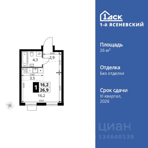 Прямая продажа от застройщика! Жилой Комплекс класса Комфорт Плюс. Продаётся квартира-студия номер 266 общей площадью 26.9 кв.м. на 13-м этаже 18 этажного здания. Без отделки. Особенности квартиры: - Квартиры рядом с метро - м. Корниловская 9 мин пешком - 63 га лесопарка за окнами - Школа c it-кластером и бассейном. 2 детских сада - Линейная планировка - максимальная функциональность и удобство. - Увеличенное количество окон - дополнительное освещение и свежий воздух. - Просторная ванная - место для расслабления и уединения. - Ниша под шкаф - компактное и удобное место для вещей. Информация о комплексе: В жилом комплексе комфорт-плюс класса "1-го Ясеневского" доступны преимущества двух стилей жизни. Ведь в пешей доступности метро, школа с 25-метровым бассейном и IT-кластером и при этом целых 63 га благоустроенного Троицкого лесопарка под окнами, где так приятно дышать свежим воздухом и слушать пение птиц. Собственная закрытая территория "1-го Ясеневского" представляет собой уютный оазис. Здесь и зеленый освещенный бульвар для прогулок, система велодорожек, маленькая городская площадь, кафе, пекарни и кофе поинты. А еще дворы без машин и многоэтажная парковка. Изюминка территории - фруктовые деревья во дворах и городские сады. "1-й Ясеневский" - всего в 1 км от МКАД, на территории новой Москвы. Жилой комплекс, где есть все необходимое для современного человека. Транспортная доступность: До метро "Корниловская" - 12 минут пешком До метро "Тютчевская" - 25 минут пешком До метро "Теплый стан" - 10 минут на транспорте До метро "Ольховая" - 30 минут на общественном транспорте Личный автотранспорт: Выезд на Калужское шоссе - 500 м МКАД - 1 км Внутренняя инфраструктура: ЖК "1-й Ясеневский" можно назвать идеальным местом для жизни семьи с детьми. Здесь буквально за домом находится Троицкий лесопарк - излюбленное место прогулок молодых родителей. А во внутренних дворах под детские площадки выделены специальные зоны. Они оборудованы всем, что нужно для счастливого детства: современными и максимально безопасными качелями, песочницами и лазалками. Оборудование и игровые сценарии на детских площадках спроектированы вместе с командой детских психологов для правильного развития ребенка и для повышения их интереса. Также рядом с домом два детских садика, один из которых уже построен и школа на 1100 мест. Школу по праву можно назвать образцовым учебным заведением. В ней закладываются основы успешного будущего. Здесь есть класс робототехники, IT-кластер, 25-метровый бассейн и прекрасно оборудованные спортзалы.