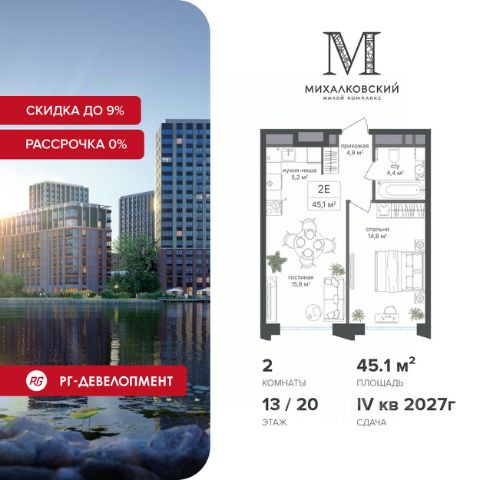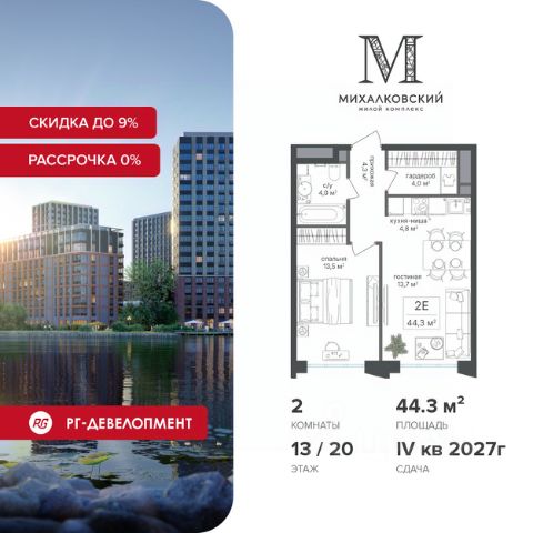 Ипотека для каждого! Полная стоимость кредита от 11,578% до 22,490%. Ставка от 0,11% в АО "Альфа-Банк" фиксируется на 1 год с даты заключения кредитного договора, далее полная стоимость кредита от 25,819% до 28,767% ставка 21,59% до окончания срока кредитования. Первоначальный взнос — от 20% от стоимости квартиры. Срок кредитования — от 3 до 30 лет. Скидка 9% при покупке квартиры! Продаётся 2-к квартира 38,5 кв.м. в ЖК "Михалковский" на 13-м этаже 20 этажного дома. Компания "РГ-Девелопмент" предоставляет скидки на квартиры в жилом комплексе. Акция действительна с 12.09.2024 г. до 15.11.25г. включительно. Для того чтобы воспользоваться предложением, необходимо подписать договор на приобретение недвижимости до 15.11.25г., включительно. Рассрочка 0% + Скидка 5%. При приобретении дольщиком квартиры в любом из двух данных корпусов с использованием способа оплаты "Рассрочка 0%", у покупателя также есть право воспользоваться скидкой в размере 5% от полной стоимости квартиры. Условия программы рассрочки: Первый платеж составляет 20% от стоимости объекта и вносится при заключении ДДУ. Второй платеж в размере 20% от стоимости объекта вносится по истечении 12 месяцев со дня подписания ДДУ. Оставшаяся сумма, в размере 60%, выплачивается за месяц до планового срока ввода ЖК в эксплуатацию, то есть не позднее 31.05.2027. Действует на приобретение квартир в корп. 2, 7. Действует программа "Растет семья - растет и квартира". Прямая продажа от застройщика! Старт продаж новых корпусов. Квартиры без отделки. Срок сдачи IV кв. 2027г. Особенности проекта: Завораживающие виды Красивое благоустройство Уникальная локация для Москвы (рядом Головинский парк, пруды, усадьба Михалково) Рядом с центром В проекте присутствует: архитектура голландского бюро MLA+, зеленые зоны, транспортная доступность, благоустроенная территория, подземный паркинг, детский сад и выход на Головинский парк с пятью прудами. Название комплекса указывает на одну из его черт - соседство с имением Михалково. Позвольте себе жить в месте, где проводили свой досуг династии Дашковых и Паниных.