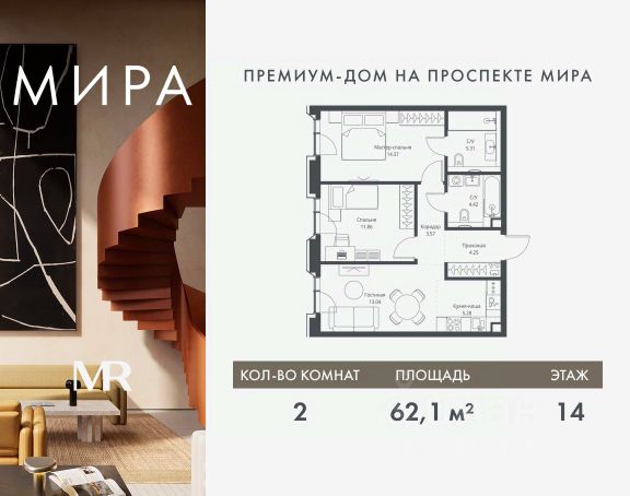 Прямая продажа от застройщика. Продаётся 2-комнатная квартира общей площадью 58.56 м² без отделки в доме премиум-класса МИРА на 14-м этаже 23 этажного дома. Квартира расположена в корпусе 2. Дом премиум-класса МИРА это: • Спокойный район с богатой историей и сложившейся инфраструктурой • Авторская архитектура на стыке классики и современности • Вход в парк прямо из жилого комплекса • Панорамные виды на Яузу, парки, ВДНХ и скульптуру "Рабочий и колхозница" • Удобные сервисы и безопасность для каждого резидента Расположение: Жилой квартал расположен в Алексеевском районе на северо-востоке Москвы, на второй линии домов, таким образом вы сможете дистанцироваться от шума и суеты проспекта Мира, но при этом будете жить недалеко от этой важной городской магистрали. Прямо у дома: • Парк Акведук • Река Яуза • Памятник "Рабочий и колхозница" Пешком: • 16 мин м. ВДНХ На автомобиле: • 12 мин ТТК • 15 мин Садовое кольцо • 12 мин Национальный парк "Лосиный остров" Благоустройство: Концепция благоустройства от бюро "ДРУЖБА" разработана в стиле "Лесная тропа". В уютном дворе расположились словно затерянные в лесу, площадки для отдыха. Они разделяются островками с травами, кустарниками, крупными камнями и деревьями, между которыми проходят узкие песчаные тропинки с деликатной подсветкой по вечерам. Центральной точкой притяжения для жителей станет главная площадь с фонтаном, которая открывается сразу из двух входных групп. Внутренний двор МИРА: • Детская площадка с зонами для игр малышей до трех лет и детей более старшего возраста • Спортивная площадка с профессиональным оборудованием для тренировок • Декоративные перголы • Воздушный арт-объект с подсветкой, похожий на облако • Чайный домик, где в отдельном отапливаемом павильоне можно в любое время года попить кофе с соседями или устроить камерное семейное чаепитие • Зоны для работы и отдыха с гамаком под навесом, скамейками и креслами Инфраструктура и окружение: В Алексеевском районе есть огромные благоустроенные парки, магазины, гимназии с высоким рейтингом и филиалы ВУЗов, частные и государственные детские сады, модные кофейни и фитнес-центры. В квартале МИРА предусмотрены: • 2 ресторана с видом на парк Акведук • 3 кафе • фитнес-студия • подземный паркинг на 330 машино-мест Компания MR предлагает своим клиентам специальные условия приобретения квартир в рамках программ ипотечного кредитования от банков-партнеров.