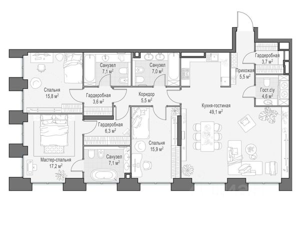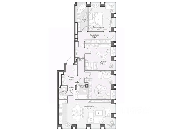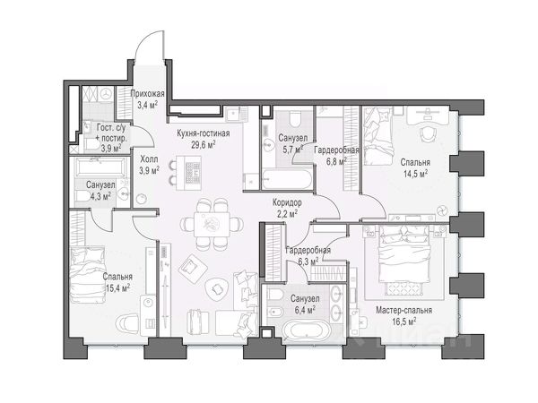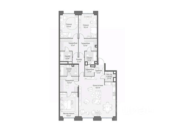 Планировка продумана для комфортной жизни семьи — просторная кухня-гостиная с обеденной зоной, мастер-спальня с гардеробной и собственным санузлом, две изолированные спальни правильной формы, которые можно использовать как детскую, кабинет или гостевую. В квартире два полноценных санузла, предусмотрены встроенные системы хранения, что делает пространство удобным и эргономичным