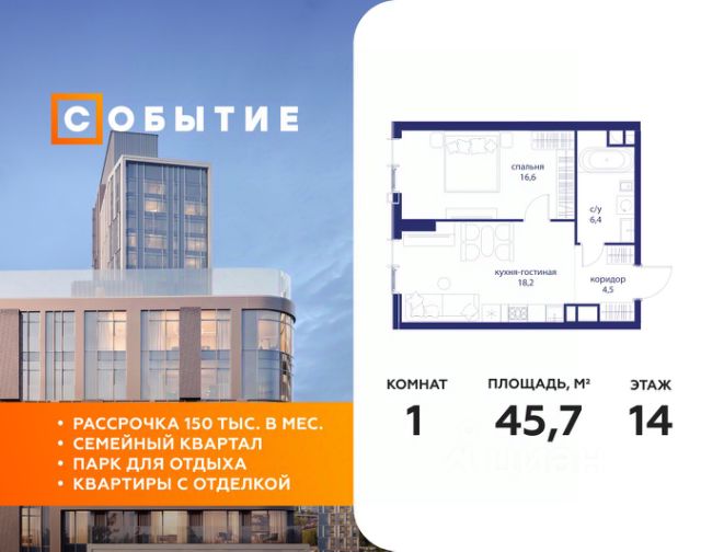В продаже 3-к квартира от застройщика. Общая площадь 99.70, жилая 45.90, кухня 23. Квартира расположена на 14 этаже жилого квартала "Событие-6", корпус 2, 1. Квартира без отделки. Срок сдачи: 4 кв. 2029 года. СОБЫТИЕ.6 — финальный дом парк-квартала СОБЫТИЕ на Мосфильмовской. Переезжайте в уже сформированный квартал с готовой инфраструктурой и парком! Премиальный жилой комплекс в престижном районе Москвы предлагает стильную архитектуру, продуманное благоустройство и великолепно разнообразие общественных пространств. Свой парк прямо возле дома! Архитектура Архитектура СОБЫТИЯ.6 выполнена в ультрасовременном стиле московским бюро Atrium на основе дизайн-кода британских архитекторов LDA Design и UHA London. Дом отличает оригинальная геометрия фасадов, большое остекление и высокие лобби (до 6,2 м) с авторской мебелью и светильниками. Расположение Мосфильмовская улица (Раменки) — один из престижных районов Москвы. Близость к историческому и деловому центру, природным зонам Запада столицы. Транспортная доступность: • 10 мин до Москва-Сити и ТТК; • 15 мин до Садового кольца; • 25 мин до аэропорта Внуково; • 7-10 мин до станций метро "Аминьевская" и "Мичуринский проспект". Инфраструктура: • парк "Событие" (12 га, финалист конкурса Правительства Москвы) с беговыми (1,5 км) и велодорожками (2,7 км), экотропой (1,6 км), площадками, лекторием; • школа, детский сад, магазины, салоны красоты, рестораны (к моменту заселения); • мультидвор с игровыми и спортивными площадками, мини-бульваром; • общественная терраса на 10-м этаже (коворкинг, лаунж); • Закрытые общественные пространства: детская комната, спортивный зал, коворкинг, лаунж-зоны. Паркинг 256 мест для жителей (48 — для электромобилей), 24 гостевых (5 — для электромобилей), мойки колес, кладовые, зоны для велосипедов. Окружение Парки и заповедники (Воробьёвы горы, Матвеевский лес и др.), МГУ, театр им. Н. И. Сац, стадион "Лужники". Безопасность Видеонаблюдение, контроль доступа, видеодомофоны, консьерж-сервис 24/7, системы пожарной безопасности и мультисервисная оптическая сеть.