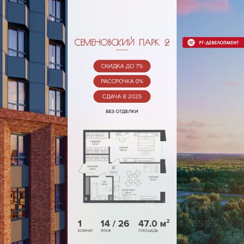 Ипотека для каждого! Полная стоимость кредита от 11,578% до 22,490%. Ставка от 0,11% в АО "Альфа-Банк" фиксируется на 1 год с даты заключения кредитного договора, далее полная стоимость кредита от 25,819% до 28,767% ставка 21,59% до окончания срока кредитования. Первоначальный взнос — от 20% от стоимости квартиры. Срок кредитования — от 3 до 30 лет. Ипотека на весь срок! Полная стоимость кредита от 23,396% до 26,058% со ставкой 14,5%! Первоначальный взнос —от 20,01% от стоимости квартиры. Срок кредитования — от 3 до 30 лет. АО "Банк ДОМ.РФ" универсальная лицензия Банка России 2312 от 19.12.2018. Скидка 7% при покупке квартиры! Цена указана с учетом максимального размера скидки. Продается 1-к квартира 45,9 кв.м. в ЖК "Семеновский парк 2" на 14-м этаже 18 этажного дома. Компания "РГ-Девелопмент" предоставляет скидки на квартиры в жилом комплексе. Акция действительна с 12.09.24 г. до 30.11.25г. включительно. Чтобы воспользоваться предложением, необходимо подписать договор на приобретение недвижимости до 30.11.25г., включительно. Прямая продажа от застройщика! Квартиры без отделки. Срок сдачи корпуса - 4 кв. 2025 г. ЖК "Семеновский парк 2" - это идеальное место для того, чтобы стать вашим домом. Проект расположен в исторической части Москвы вблизи Измайловского лесопарка, в 1 км от ЦАО. 4 станции метро отделяют вас от Красной площади и 15 минут на автомобиле - от Садового кольца.