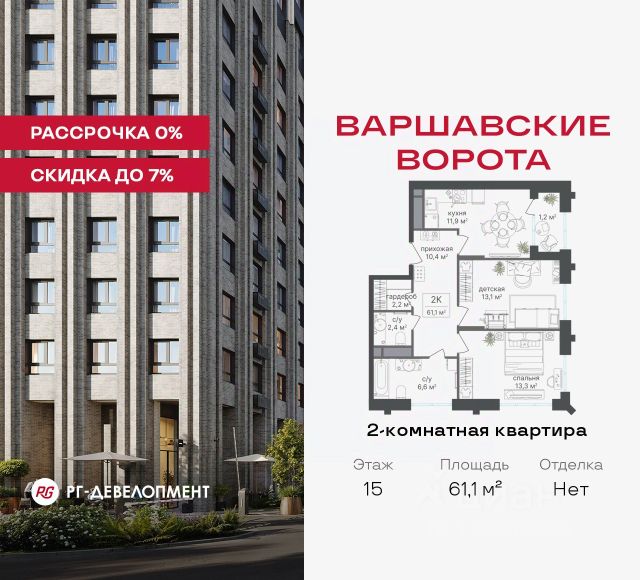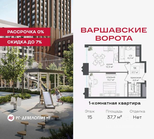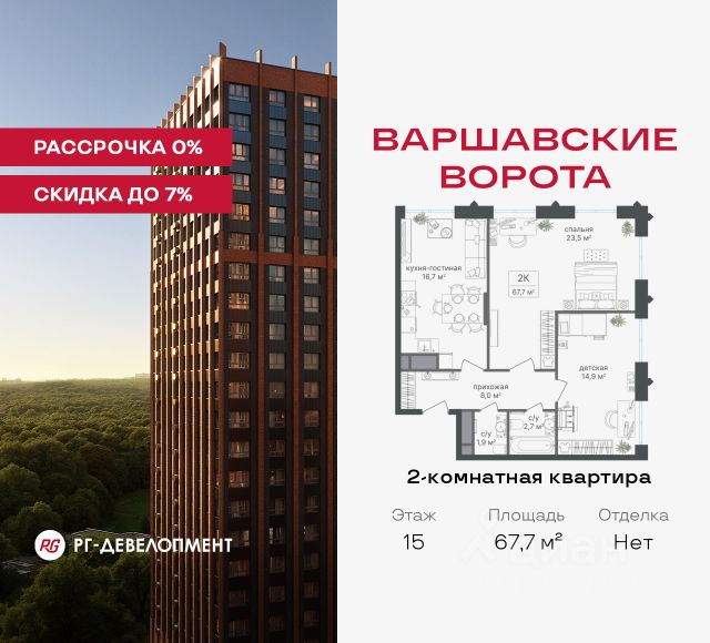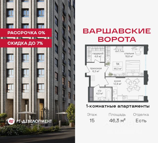 Рассрочка 0% + скидка 5%. Первый платёж 50% при ДДУ, второй 50% — через 12 мес. до ввода ЖК. Продаются 1-комнатные апартаменты 46,3 кв.м. в МФК "Варшавские ворота" на 15-м этаже 30 этажного дома. МФК "Варшавские ворота" — это проект, в котором учтен широкий спектр требований: от транспортной доступности и развитой инфраструктуры до архитектурной выразительности и экологического окружения. Апартаменты в МФК "Варшавские ворота" подойдут для тех, кто ищет продуманное жилье в Москве или готовый инвестиционный актив. Апартаменты здесь — это: - возможность жить комфортно в удобном городском формате — с природой, метро, сервисом и паркингом; - возможность купить лот с готовой отделкой, чтобы вложить минимальные инвестиции в ремонт и получить максимум возможностей от сдачи; - экономия на налоге на имущество, кадастровая стоимость апартаментов ниже ~ на 30% кадастровой стоимости квартиры; - высокая инвестиционная доходность объекта за счет более низкой цены покупки по сравнению с квартирой. Коротко о важном: - 1 минута пешком от м. Аннино; - Удобные выезды на Варшавское шоссе и МКАД; - Вид из окон на Битцевский лес и Аннинский лесопарк; - Высота потолков 2,7 - 3 м; - Закрытый двор-парк; - Школы и детские сады в 10-15 минутах пешком от дома; - Технические лоджии для размещения кондиционеров; - Подземный паркинг; - РГ-Девелопмент — ТОП-20 крупнейших застройщиков России. Проект сочетает в себе современную архитектуру и продуманное благоустройство с уникальным природным окружением. Всего в нескольких минутах от дома — девять парков, каскад прудов и крупнейшие лесопарковые зоны Москвы, создающие ощущение жизни в зеленом оазисе посреди мегаполиса. Архитектурная концепция - стиль Чикаго в Москве. Выполнена в минималистичной эстетике с использованием клинкера и декоративного кирпича. Фасады подчеркивают строгие линии и современный стиль, а входные группы разработаны московским бюро Syntaxis. Лобби оформлены с применением керамогранита, декоративной штукатурки и гипсовых панелей, детали из латуни добавляют изысканности. Пространство оживляют гербарии, композиции из сухоцветов и авторские панно. Проект находится в одной минуте пешком от метро "Аннино", в 12 минутах от станции "Улица Академика Янгеля" и рядом с МЦД-2 "Красный Строитель". Для автомобилистов предусмотрен прямой выезд на Варшавское шоссе и два съезда на МКАД, что позволяет быстро добираться в любую часть города. Среди планировочных решений представлены разнообразные форматы: от функциональных студий до просторных 4-комнатных квартир и апартаментов площадью от 22 до 105 м². Высокие потолки усиливают ощущение простора, а продуманные планировки включают мастер-спальни, гардеробные, угловые окна, объединённые кухни-гостиные и несколько санузлов. Центральное пространство комплекса — закрытый двор без машин. Он разделён на функциональные зоны: детские игровые комплексы, спортивные площадки, воркаут-зоны и уютные места для тихого отдыха. На первых этажах размес