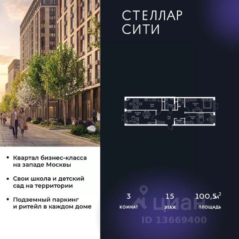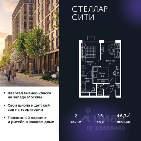 Продается квартира от надежного застройщика Tashir Estate в квартале бизнес-класса Stellar City в ЗАО Москвы. Площадь квартиры составляет: 46.1 кв. м, потолки: 3.1 м Квартира находится на 15 этаже, 4 корпуса жилого квартала Stellar City — микрогорода будущего на орбите Москвы. Stellar City — квартал в ЗАО Москвы вблизи инновационного центра Сколково. В окружении — 11 парков и природных зон, в том числе Долина реки Сетунь, Мещерский лес и парк развлечений The Rink. Город в городе Чтобы дом и инфраструктура вокруг отвечала динамичному лайфстайлу жителя мегаполиса, в основу проекта легла концепция город в городе, которая позволяет решать все бытовые вопросы in-home. В квартале будут возведены школа и детский сад, воркаут-зоны, променад, вело и беговые дорожки, детские площадки для каждого корпуса, а также коммерция на первых этажах для ежедневных покупок. Все необходимое — на расстоянии нескольких шагов. Изящные и лаконичные лобби Авторский дизайн, натуральные материалы в отделке и безупречный интерьер вне времени. Лобби и холлы в проекте бизнес-класса Stellar City ничем не отличаются от входных групп в премиум-сегменте благодаря качественным европейским материалам в отделке, стильному дизайну, консьерж-сервису и уютной зоне ожидания с журнальными столиками и мягкой мебелью. Комфорт и безопасность Закрытая территория, охрана, система СКУД, специально разработанное мобильное приложение дома для резидентов и подземный паркинг с круглосуточным наблюдением и доступом с помощью автоматического считывания номера авто.