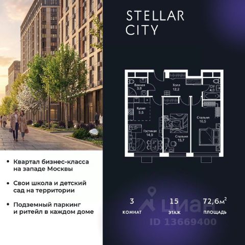 Продается квартира от надежного застройщика Tashir Estate в квартале бизнес-класса Stellar City в ЗАО Москвы. Площадь квартиры составляет: 46.1 кв. м, потолки: 3.1 м Квартира находится на 15 этаже, 4 корпуса жилого квартала Stellar City — микрогорода будущего на орбите Москвы. Stellar City — квартал в ЗАО Москвы вблизи инновационного центра Сколково. В окружении — 11 парков и природных зон, в том числе Долина реки Сетунь, Мещерский лес и парк развлечений The Rink. Город в городе Чтобы дом и инфраструктура вокруг отвечала динамичному лайфстайлу жителя мегаполиса, в основу проекта легла концепция город в городе, которая позволяет решать все бытовые вопросы in-home. В квартале будут возведены школа и детский сад, воркаут-зоны, променад, вело и беговые дорожки, детские площадки для каждого корпуса, а также коммерция на первых этажах для ежедневных покупок. Все необходимое — на расстоянии нескольких шагов. Изящные и лаконичные лобби Авторский дизайн, натуральные материалы в отделке и безупречный интерьер вне времени. Лобби и холлы в проекте бизнес-класса Stellar City ничем не отличаются от входных групп в премиум-сегменте благодаря качественным европейским материалам в отделке, стильному дизайну, консьерж-сервису и уютной зоне ожидания с журнальными столиками и мягкой мебелью. Комфорт и безопасность Закрытая территория, охрана, система СКУД, специально разработанное мобильное приложение дома для резидентов и подземный паркинг с круглосуточным наблюдением и доступом с помощью автоматического считывания номера авто.