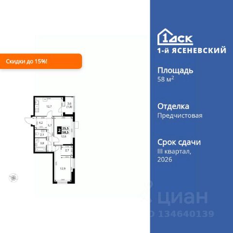 Прямая продажа от застройщика! Жилой Комплекс класса Комфорт Плюс. Продаётся 2-к квартира номер 552 общей площадью 58.5 кв.м. на 15-м этаже 18 этажного здания. Отделка Whitebox. Цена с учётом скидки. Особенности квартиры: - Квартиры рядом с метро - м. Корниловская 9 мин пешком - 63 га лесопарка за окнами - Школа c it-кластером и бассейном. 2 детских сада - Мастер-зона с гардеробной. Просторное место для отдыха и удобного хранения вещей. - Угловая планировка - больше пространства для ваших идей. - Увеличенное количество окон - дополнительное освещение и свежий воздух. - Раздельный санузел - больше удобства для всех членов семьи. - Можно оборудовать рабочее место - комфорт для работы и учёбы. - Гардеробная - удобство для хранения и организации вещей. - Ниша под шкаф - компактное и удобное место для вещей. - Лоджия - уютное место для отдыха и тишины. Квартира с предчистовой отделкой (White box). Вам не придется заниматься черновыми и трудоёмкими работы, а чистовую отделку и дизайн - сделайте на свой вкус. Информация о комплексе: В жилом комплексе комфорт-плюс класса "1-го Ясеневского" доступны преимущества двух стилей жизни. Ведь в пешей доступности метро, школа с 25-метровым бассейном и IT-кластером и при этом целых 63 га благоустроенного Троицкого лесопарка под окнами, где так приятно дышать свежим воздухом и слушать пение птиц. Собственная закрытая территория "1-го Ясеневского" представляет собой уютный оазис. Здесь и зеленый освещенный бульвар для прогулок, система велодорожек, маленькая городская площадь, кафе, пекарни и кофе поинты. А еще дворы без машин и многоэтажная парковка. Изюминка территории - фруктовые деревья во дворах и городские сады. "1-й Ясеневский" - всего в 1 км от МКАД, на территории новой Москвы. Жилой комплекс, где есть все необходимое для современного человека. Транспортная доступность: До метро "Корниловская" - 12 минут пешком До метро "Тютчевская" - 25 минут пешком До метро "Теплый стан" - 10 минут на транспорте До метро "Ольховая" - 30 минут на общественном транспорте Личный автотранспорт: Выезд на Калужское шоссе - 500 м МКАД - 1 км Внутренняя инфраструктура: ЖК "1-й Ясеневский" можно назвать идеальным местом для жизни семьи с детьми. Здесь буквально за домом находится Троицкий лесопарк - излюбленное место прогулок молодых родителей. А во внутренних дворах под детские площадки выделены специальные зоны. Они оборудованы всем, что нужно для счастливого детства: современными и максимально безопасными качелями, песочницами и лазалками. Оборудование и игровые сценарии на детских площадках спроектированы вместе с командой детских психологов для правильного развития ребенка и для повышения их интереса. Также рядом с домом два детских садика, один из которых уже построен и школа на 1100 мест. Школу по праву можно назвать образцовым учебным заведением. В ней закладываются основы успешного будущего. Здесь есть класс робототехники, IT-кластер, 25-метровый бассейн и прекрасно оборудов