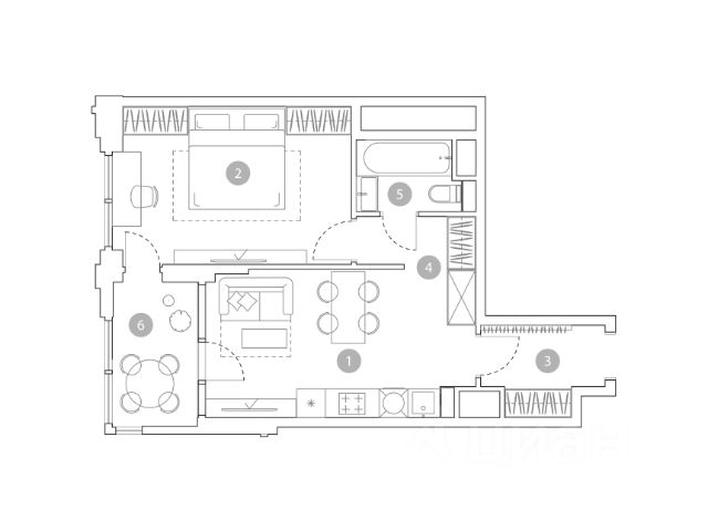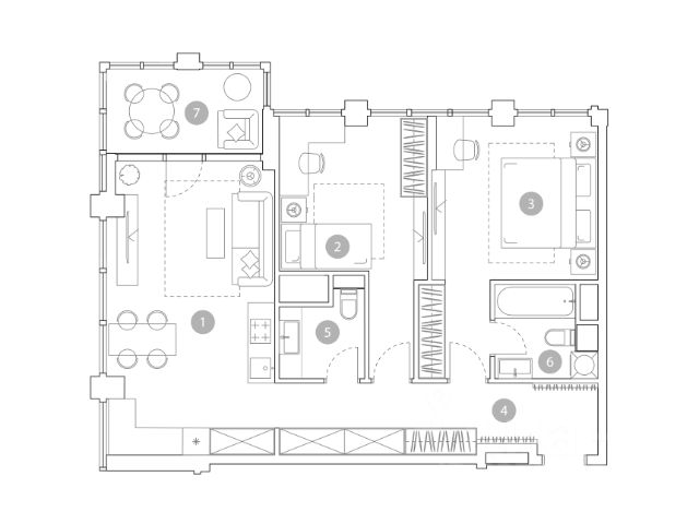- широкая кухня-гостиная с обеденной зоной, рабочим уголком, местом отдыха и открытой лоджией;