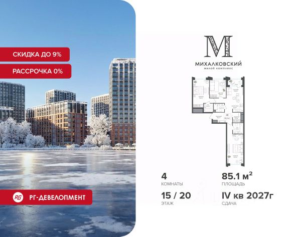 Скидка 9% при покупке квартиры! Цена указана с учетом максимального размера скидки. Продаётся студия 26,7 кв.м. в ЖК "Михалковский" на 15-м этаже 20 этажного дома. Ипотека для каждого! Полная стоимость кредита от 12,378% до 18,537%. Ставка от 0,11% в АО "Альфа-Банк", ген. лицензия ЦБ РФ 1326 от 16.01.2015. Ставка фиксируется на первые 12 месяцев, далее полная стоимость кредита от 22,025% до 24,935% ставка 21,59%. Первоначальный взнос — от 20,1% от стоимости квартиры. Срок кредитования — от 4 до 30 лет. Компания "РГ-Девелопмент" предоставляет скидку на квартиры в жилом комплексе. Акция действительна до 28.02.2026 включительно. Чтобы воспользоваться предложением, необходимо подписать договор на приобретение недвижимости до 28.02.2026 включительно. При приобретении квартиры доступна беспроцентная рассрочка с первым платежом от 30%. У покупателя также есть право воспользоваться скидкой в размере 7% от полной стоимости квартиры. Условия программы рассрочки: - Скидка 7% - Первый платеж — от 30% от стоимости объекта. - Оставшаяся сумма выплачивается не позднее 31.05.2026. - Действует на приобретение квартир в корп. 4, 5 Действует программа "Растет семья - растет и квартира". Компания "РГ-Девелопмент" вошла в ТОП-10 девелоперов по объёму введённого жилья в "Старой Москве" по итогам 2025 года. Прямая продажа от застройщика! Квартиры без отделки. Срок сдачи 1 кв. 2026 г. Особенности проекта: Завораживающие виды Красивое благоустройство Уникальная локация для Москвы (рядом Головинский парк, пруды, усадьба Михалково) Рядом с центром В проекте присутствует: архитектура голландского бюро MLA+, зеленые зоны, транспортная доступность, благоустроенная территория, подземный паркинг, детский сад и выход на Головинский парк с пятью прудами. Название комплекса указывает на одну из его черт - соседство с имением Михалково. Позвольте себе жить в месте, где проводили свой досуг династии Дашковых и Паниных.