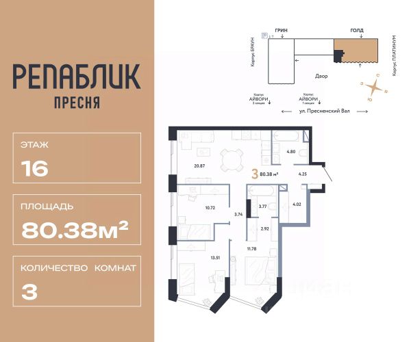 Рассрочка 0% с первым взносом от 20%, ипотека с субсидией или наличные. Подберём способ оплаты индивидуально. Продается 4комнатная квартира на 16 этаже от застройщика Страна Девелопмент. Площадь квартиры 80.38 кв. м. Дизайн-квартал "Republic" — новый проект премиум-класса в Москве от федерального застройщика "Страна Девелопмент". ЦАО, Пресня, 7 мин. от метро "Белорусская". 10 жилых башен и 4 восстановленных здания локомотивного депо образуют уникальное пространство. "Republic" — место, где вы ощутите гармонию истории и современности. За 12 мин. вы сможете дойти до Московского зоопарка, за 10 мин. на авто доехать до Патриарших прудов и Белого дома. Преимущества • Благоустройство. SPA-комплекс с бассейном и термами, гастрономический, учебный и шопинг-центры, приватный бульвар и яркие арт-пространства — для жителей предусмотрены все элементы премиального комфорта. • Панорама на центр. Наслаждайтесь видами ЦАО каждый день: панорама на историческую Пресню и башни Москва-Сити — из своей квартиры или с приватной террасы на крыше. • Концептуальное лобби в каждой башне. С общей террасой на кровле, с библиотекой, коворкингом и фитнес-рум. Стойка консьержа перетекающая в бар и др. • Современные форматы квартир. Свободные планировки, с террасой или балконом, с возможностью установки камина, от 1-комнатных до пентхаусов. Отделка Квартиры сдаются без отделки или в формате White box. При White box уже выполнены все шумные и грязные работы: произведена разводка электричества с подрозетниками, установлены откосы из гипсокартона, устроена стяжка пола с шумоизоляцией и др. Способы покупки Сотрудники "Страна Девелопмент" будут сопровождать вас на каждом этапе сделки, помогут получить одобрение по ипотеке или снизить ежемесячный платеж. - ипотека (стандартная/с субсидией/траншевая) - рассрочка (с ПВ от 20%) - с использованием материнского капитала - оплата наличными