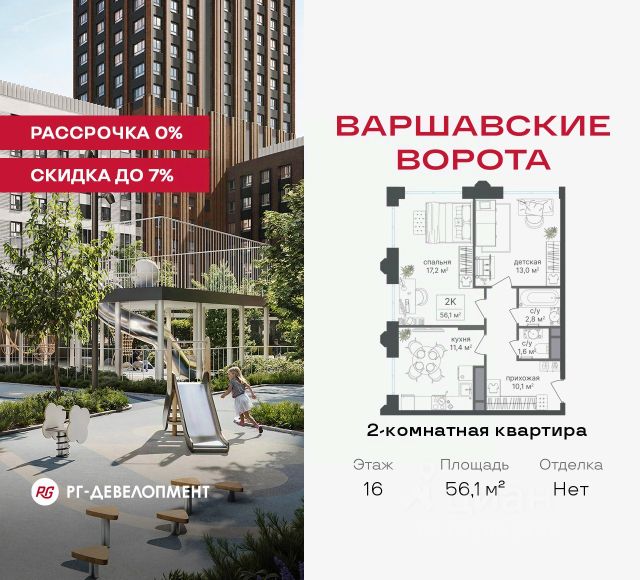 Рассрочка 0% + скидка 5%. Первый платёж 50% при ДДУ, второй 50% — через 12 мес. до ввода ЖК. Продаётся 2-комнатная квартира 56,1 кв.м. в МФК "Варшавские ворота" на 16-м этаже 30 этажного дома. МФК "Варшавские ворота" — это точка баланса между природой и городом, стилем и функциональностью, жизнью сегодня и устойчивым будущим. Коротко о важном: - 1 минута пешком от м. Аннино; - Удобные выезды на Варшавское шоссе и МКАД; - Вид из окон на Битцевский лес и Аннинский лесопарк; - Высота потолков 2,7 - 3 м; - Закрытый двор-парк; - Школы и детские сады в 10-15 минутах пешком от дома; - Технические лоджии для размещения кондиционеров; - Подземный паркинг; - РГ-Девелопмент — ТОП-20 крупнейших застройщиков Москвы. Проект сочетает в себе современную архитектуру и продуманное благоустройство с уникальным природным окружением. Всего в нескольких минутах от дома — девять парков, каскад прудов и крупнейшие лесопарковые зоны Москвы, создающие ощущение жизни в зеленом оазисе посреди мегаполиса. Архитектурная концепция - стиль Чикаго в Москве. Фасады облицованы вентфасадами под клинкерную плитку. Металлические вставки придают динамику, подчёркивая современный характер комплекса. Фасады подчеркивают строгие линии и современный стиль, а входные группы разработаны московским бюро Syntaxis. Лобби оформлены с применением керамогранита, декоративной штукатурки и гипсовых панелей, детали из латуни добавляют изысканности. Проект находится в одной минуте пешком от метро "Аннино", в 12 минутах от станции "Улица Академика Янгеля" и рядом с МЦД-2 "Красный Строитель". Для автомобилистов предусмотрен прямой выезд на Варшавское шоссе и два съезда на МКАД, что позволяет быстро добираться в любую часть города. Среди планировочных решений представлены разнообразные форматы: от функциональных студий до просторных 4-комнатных квартир и апартаментов площадью от 22 до 105 м². Высокие потолки усиливают ощущение простора, а продуманные планировки включают мастер-спальни, гардеробные, угловые окна, объединённые кухни-гостиные и несколько санузлов. Центральное пространство комплекса — закрытый двор без машин. Он разделён на функциональные зоны: детские игровые комплексы, спортивные площадки, воркаут-зоны и уютные места для тихого отдыха. На первых этажах разместятся магазины, кафе и сервисы, что позволит решать повседневные задачи, не покидая территорию комплекса. Для семей с детьми предусмотрен частный детский сад на 50 мест. Подземный паркинг и кладовые обеспечат удобство хранения и безопасность автомобилей. Комплекс окружён девятью парками и лесопарками, каждый из которых обладает своей атмосферой. Выйти на пробежку в Аннинском лесопарке, насладиться прогулками по обширным аллеям в Битцевском лесу, спланировать пикник или велопрогулку в Покровском и Народном парках, любоваться каскадом Кировоградских прудов. Всего в двух станциях — музей-заповедник "Царицыно" с дворцами, фонтанами и живописными пейзажами. Здесь каждый житель найдёт своё любимое ме