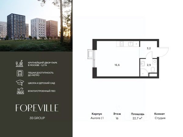 Предчистовая отделка в подарок! Пешая доступность от метро и московская прописка! Продается уютная студия площадью 21,3 кв.м на 16 этаже 17 этажного жилого комплекса бизнес-класса Foreville от 3S Group. Общая площадь: 21,3 кв.м., жилая: 7,3 кв.м., площадь кухни-гостиной: 6,3 кв.м., высота потолков: 3 м., окна выходят во двор. Квартира предлагается без отделки, что идеально подходит для воплощения собственного дизайнерского решения. Также доступна опция предчистовой отделки, стоимость которой включается в общую цену квартиры. О проекте: Пространство Комплекс располагает крупнейшим приватным двор-парком в Новой Москве площадью 1,2 Га, предлагая жителям огромное пространство для отдыха, спорта и игр на свежем воздухе. Природный ландшафт Внутренний лесопарк с более чем 183 взрослыми деревьями и 10 320 цветущими кустарниками создает уникальную природную атмосферу для каждого времени года. Игровые и спортивные зоны Обширные площадки с безопасным покрытием, специализированные зоны для детей разных возрастных групп и взрослых, включая воркаут и настольный теннис, способствуют активному и здоровому образу жизни. Экологичность и долговечность Использование натуральных материалов, таких как лиственница, и крупноформатной бетонной плитки для покрытия, подчеркивает стремление проекта к экологичности и устойчивости. Безопасность и уединение Внутренний двор без машин обеспечивает безопасность для детей и спокойствие для взрослых. Территория огорожена и находится под круглосуточным видеонаблюдением. Сохранение времени Благодаря превосходной транспортной доступности и близости к новой станции метро Корниловская, Foreville позволяет жителям экономить время для семьи и отдыха на природе, минимизируя необходимость длительных поездок. Foreville не просто жилье, а целая экосистема для комфортной и гармоничной жизни на свежем воздухе, совмещая преимущества городской инфраструктуры и непосредственную близость к природе.