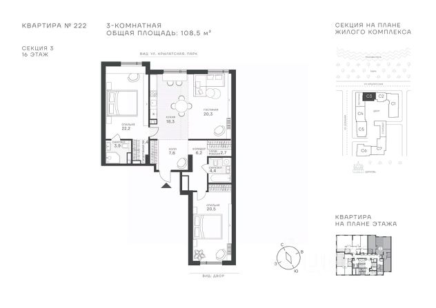 Продается 2-к квартира площадью 107.9 кв.м. на 16-м этаже в ЖК "Клубный квартал Крылатская 33". Прямая продажа от застройщика! Крылатская 33 - проект премиум-класса на западе Москвы от специализированного застройщика "Сияние". Комплекс расположен всего в 15 минутах от Садового кольца и Москва-Сити, а рядом есть большое количество зелёных зон: Крылатский и Москворецкий парки, Серебряный бор, Крылатские холмы - это создает идеальный баланс между приватностью и динамичным ритмом мегаполиса. Квартал сочетает высотные башни до 150 метров и камерные малоэтажные корпуса. Витражное остекление "в пол" наполняет квартиры светом и открывает захватывающие панорамы на Москву-реку и знаковые виды столицы. Здесь каждый найдет то, что подходит именно ему - от уютных студий до роскошных пентхаусов и квартир с собственными террасами. Внутренняя среда жилого комплекса продумана до мельчайших деталей, чтобы резиденты могли продуктивно работать и качественно отдыхать, не покидая территорию: • фитнес-центр, включающий в себя СПА-зону; • коворкинг с кофейней и быстрым интернетом; • общественная гостиная для организации клубных мероприятий; • ресторан с панорамным остеклением; • благоустроенный сад с зоной отдыха; • инновационная игровая площадка для детей всех возрастов; • консьерж-сервис 24/7, современные системы видеонаблюдения и пожаротушения; • двухуровневый паркинг и многое другое. Район Крылатское - точка притяжения для тех, кто выбирает активный образ жизни. В непосредственной близости расположены Гребной канал, Олимпийский велотрек, горнолыжный комплекс "Лата Трэк", гольф-клуб и парковые зоны. В проекте действуют привлекательные условия покупки: - выгода до 10% при 100% оплате (действует на ограниченный пул квартир, подробности уточняйте в отделе продаж). - рассрочка от застройщика 0% с первоначальным взносом от 20% на срок до 30.06.2027.