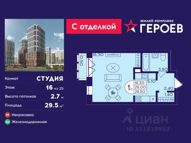 Продаётся студия 29.5 кв. м. в жилом комплексе "Героев" в Балашихе, Железнодорожный. Квартира расположена на 16 этаже 611 корпуса. Все квартиры представлены с чистовой отделкой. Вам не нужно тратить время и дополнительные финансы на ремонт или жить в шуме строительных работ - достаточно перевести свои вещи, расставить мебель и всё готово! Жилой квартал "Героев" - это уютный проект для семей с детьми. Всего 40 минут до центра Москвы. В квартале созданы все условия для досуга всех возрастов: игровые и спортивные площадки, места для отдыха и прогулок, магазины, кафе и пункты выдачи. За 15 минут можно дойти от дома до Ольгинского лесопарка - популярного места для прогулок и отдыха на свежем воздухе. Здесь приятно гулять всей семьёй, заниматься спортом или устроить пикник в выходной день. Преимущества: Квартира с готовой отделкой. Пространство полностью подготовлено для жизни: не нужно тратить время и деньги на ремонт или ждать его окончания. После получения ключей достаточно расставить мебель - и можно сразу заезжать и жить. Продуманные и светлые планировки. Просторные кухни-гостиные создают комфортное пространство для отдыха и встреч с близкими. В квартирах предусмотрены удобные гардеробные, благодаря чему легко поддерживать порядок и не перегружать комнаты шкафами. Увеличенное остекление. Большие окна наполняют квартиру естественным светом в течение всего дня, создавая ощущение простора и уюта, а также визуально расширяя пространство и делая интерьер более воздушным. Пешая доступность до станции Железнодорожная (МЦД-4) - дорога займёт не более 30 минут до центра Москвы: станции метро "Курская", "Площадь Ильича" или ТПУ Нижегородская.