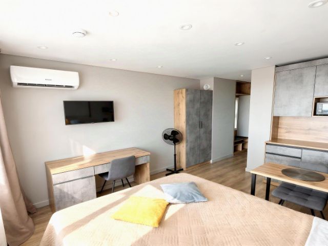 АПАРТАМЕНТЫ: Студия 20 м², 16 этаж из 24, совмещённый санузел, потолки 2,8 м. Дизайнерский ремонт с современной отделкой, окна на улицу, естественное освещение. Полностью готовы к заселению или аренде: кухня с индукционной плитой, холодильник, микроволновка, посуда, стиральная машина, кондиционер, кровать с ортопедическим матрасом, шкаф в прихожей.