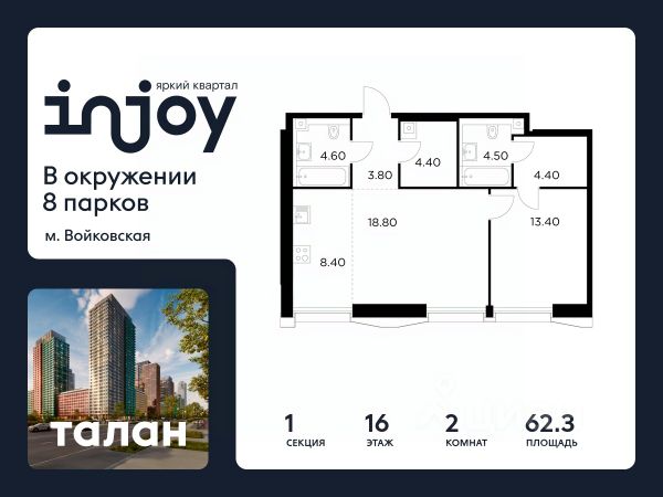 Цена указана с учётом скидки при 100%-й оплате, несубсидированной ипотеке, рассрочке (кроме программы "Рассрочка 0%"). Продается 2-комнатная квартира площадью 62.30 кв. м с отделкой. Квартира находится на 16 этаже 26-этажного корпуса 4, в новом жилом комплексе бизнес-класса Level Войковская, расположенном рядом с живописным заповедником "Покровское-Стрешнево" (застройщик - компания Level Group/Левел групп). Прекрасная транспортная доступность - 7 мин. пешком до станции МЦК "Балтийская"; - 15 мин. пешком до станции метро "Войковская"; - 8 мин. на машине до ТТК; - 15 мин. на машине до центра Москвы; - 20 мин. на машине до Москва-Сити. Продуманный архитектурный проект - стильная архитектура от мастерской Фефелова В. В.; - панорамные виды на парки, Химкинское водохранилище и Останкинскую башню; - лобби с высотой потолков до 6,45 метров; - более 20 видов планировочных решений, включая редкие форматы квартир с террасой и увеличенной высотой потолков до 5,42 метров; - 2 варианта дизайнерской отделки в корпусе 4, предлагаются как дополнительная опция к отделке white box: стиль Modern в светлых холодных тонах и стиль Classic в нейтральной бежевой гамме. Квартиры в корпусах 3 и 5 сдаются без отделки. Расположение Level Войковская строится в престижном Северном округе Москвы. Развитая инфраструктура и живописная природа переплетаются в единый ансамбль, столь значимый для комфортной жизни. Войковский район окружают парки и набережные. В шаговой доступности - парк "Покровское-Стрешнево", не более 15-ти минут на велосипеде занимает путь до Тимирязевского парка и 9-ти минут до парка усадьбы Михалково. Рядом более 60 школ, 75 дошкольных учреждений, 17 государственных и 6 частных вузов, 25 супермаркетов, 4 торговых центра, среди которых ТЦ "Метрополис" и ТЦ "Авиапарк". Внутренняя инфраструктура На территории жилого комплекса предусмотрены коммерческие помещения: кафе, ресторан, пекарня и другие сервисы откроются на первых этажах корпусов. Для жителей будет доступен отапливаемый подземный паркинг на 244 машино-места с доступом с любого этажа на лифте. На территории паркинга будет расположено 125 кладовых помещений для хранения сезонного инвентаря. Лобби и благоустройство Дизайн лобби Level Войковская создан совместно с бюро BLANK. Это уютные гостиные, где хочется задержаться. Теплая цветовая гамма, ресепшен, зоны ожидания, лапомойки и гостевые санузлы - каждая деталь превращает лобби в комфортное продолжение вашего дома. 1,15 га площади в первых двух этапах строительства отведено под приватный внутренний двор, который спроектирован совместно с бюро "Правда". Детские площадки для всех возрастов, спортивные пространства для йоги, воркаута и петанка, уютные зоны для тихого отдыха или работы. Здесь утро начинается с вдохновения, а вечер наполнен приятными моментами. Лифты Комфортное перемещение внутри жилого комплекса будут обеспечивать надёжные лифты с доступом в паркинг с жилых этажей. В каждом корпусе предусмотрено по 3 грузопассажирских лифта.