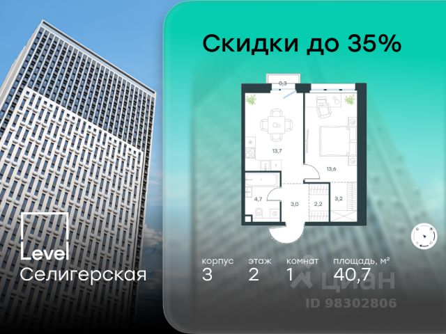 Цена указана с учётом скидки при 100%-й оплате, несубсидированной ипотеке, рассрочке (кроме программы "Рассрочка 0%"). В жилом квартале, расположенном в южной части района Западное Дегунино, продаётся 2-комнатная квартира площадью 41.00 кв.м без отделки. Квартира расположена на 2 этаже 40-этажного корпуса 3 в жилом комплексе комфорт-класса Level Селигерская (компания Level Group/Левел групп). Отличная транспортная доступность: - 10 мин. пешком до станции метро "Селигерская" от корпусов 1-й очереди; - 10 мин. пешком до станции метро "Верхние Лихоборы" от корпусов 2-й очереди; - 20 мин. пешком до станции МЦД-3 "Моссельмаш"; - 11 мин. на авто до МКАД; - 13 мин. на авто до ТТК; - 16 мин. на авто до Садового кольца. Расположение Район отличается богатой социальной инфраструктурой: школы, детские сады, поликлиники, магазины, фитнес-клубы, торговые центры - всё близко к дому. Рядом с Level Селигерская расположено 5 парковых зон. В 3 минутах от дома расположен перспективный сквер-парк. В 10 минутах пешком находится парк им. Святослава Фёдорова, в 13 минутах на велосипеде - парк "Ангарские пруды". В 7-11 минутах на автомобиле - два крупных природных объекта: Тимирязевский парк и Главный ботанический сад Российской академии наук. Благоустройство Внутренние дворы жилого комплекса огорожены от машин, а их функциональное наполнение отличается в зависимости от очереди строительства. На территории 1-й очереди будут: детская площадка, воркаут-зона, места для тихого отдыха и активных игр, а также сенсорный сад и большой луг. Во 2-й очереди жителей ждут уютные навесы с качелями, павильон-читальня, волейбольная площадка, беседки, а также детские и спортивные площадки. Технологии и инженерия Для входа на территорию комплекса предусмотрен единый ключ доступа. Все общественные зоны оснащены камерами видеонаблюдения, по заявке собственнику предоставляется возможность просмотра изображения отдельных видеокамер на его мобильном устройстве. При въезде в паркинг функционирует система распознавания госномеров. Кроме того, для комфорта жителей создано мобильное приложение, с помощью которого можно удаленно контролировать доступ на придомовую и жилую территории. Другие преимущества жилого комплекса - Высокая освещенность квартир: в большинстве из них не меньше трёх окон; - Супермаркет, магазины, кафе, пекарни и многое другое на первых этажах домов; - Частный детский сад; - Стильные дизайнерские лобби с высокими потолками до 4,9 м и окнами в пол, для питомцев предусмотрена лапомойка; - 20+ планировочных решений: от студий до семейных квартир; - С каждого этажа дома на лифте можно спуститься в подземный отапливаемый паркинг.