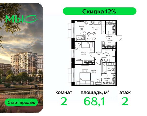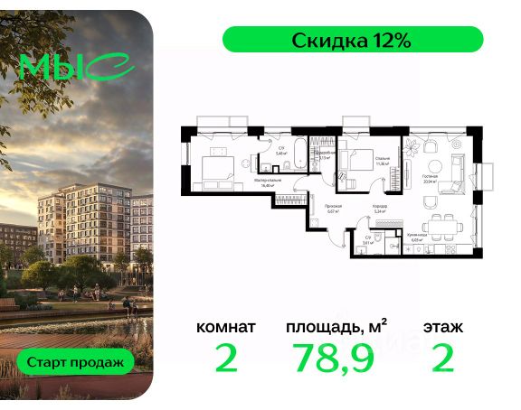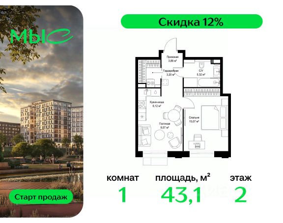 Прямая продажа от застройщика. Продаётся 1-комнатная квартира общей площадью 44.25 м² без отделки в премиальном жилом комплексе "МЫС" на 2-м этаже 12 этажного дома. Квартира расположена в корпусе "Волга". Проект МЫС — это, прежде всего, идеальное место для семей. В рамках проекта построят государственную школу, два детских сада и дворец спорта площадью 20 000 м2 с термальным комплексом, выплывным бассейном, фитнес-залом, теннисными, сквош и падел кортами и секциями для детей. На территории площадью, сравнимой с тремя парками Зарядье, появятся кафе и рестораны, пруд с набережной, спортивные и детские площадки, скейт-парк, лыжные и веломаршруты. Расположение: - 2 минуты до скоростной трассы М1 и Минского шоссе; - 10 минут до МКАД; - 15 минут до МЦД Лесной Городок - 20 минут до делового центра "Москва-Сити"; - 28 минут до аэропорта "Внуково". Благоустройство: - велосипедные и лыжные маршруты; - собственная набережная и парк; - лаунж-зоны в окружении природы; - беседки у очага; - дворец спорта площадью 20 000 м²; - термальный комплекс с тремя бассейнами; - 4 теннисных и падел-корта; - 6 сквош-кортов; - многофункциональный спортзал; - скейт-парк; - просторная площадь для прогулок с фонтаном; - детский Клуб с творческими секциями; - гастро-доминанта; - кафе у пруда, рестораны, ритейл. Окружение - соседство с лесным фондом; - школа на 1250 мест и 2 детских сада на 350 и 255 мест; - Дубковский и Подушкинский леса, парк "Рассказовка", Мещерский парк. Действуют специальные условия при 100% оплате, подробности уточняйте у менеджера в офисе продаж.