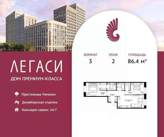 Светлая квартира общей площадью 83 м2 на 4-м этаже премиального жилого комплекса Legacy, расположенного в прекрасном зеленом районе Раменки. Отличная функциональная планировка: кухня-гостиная, 2 мастер-спальни со своими с/у и продуманной гардеробной зоной; гостевой санузел и просторный холл, который с первых шагов погружает в безупречное пространство изысканности и уюта. Жилое пространство спроектировано для исключительно комфортной жизни с возможностью реализации уникального дизайн-проекта. Для удобства будущих резидентов доступны два варианта отделки от застройщика: Premium и Elite премиальные материалы в отделке, мебель от европейских производителей, и освещение индивидуального изготовления. Жилой комплекс Legacy располагается на Мичуринском проспекте в районе с развитой инфраструктурой, богатой историей и высокой транспортной доступностью. Москва-река, Ботанический сад МГУ, главный корпус МГУ и Воробьевы горы на расстоянии прогулки от комплекса. Проект состоит из 9 секций переменной этажности от 8 до 17 этажей. В каждой секции не более 5 квартир на этаже, что обеспечивает высокий уровень приватности. Архитектура Проект Legacy разработан архитектурным бюро Speech. Его строгая лаконичность дополнена современными стандартами роскошной и комфортной жизни это бессменная классика, которая всегда вне моды. Благоустройство Свой приватный двор-сквер площадью 3 600 м2 с пространствами для всех возрастов: на территории располагаются игровые площадки, детский городок, песочница, воркаут-зоны, батуты, места для отдыха, лабиринты, настольный теннис и шахматные столы. Презентабельные лобби Дизайнерские лобби и холлы с премиальной отделкой. Изысканный стиль и высококачественные европейские материалы, отражающие высокий статус резидентов дома. Инфраструктура в доме Магазины, салон красоты, спортивная студия на первом этаже. А также ресторан Seasons, который позволяет разнообразить рацион и сделать каждый ужин особенным. Комфорт и безопасность Премиальный консьерж-сервис 24/7, круглосуточная охрана, видеонаблюдение, система СКУД, закрытый охраняемый паркинг и эксклюзивное мобильное приложение для решения бытовых вопросов резидентов.
