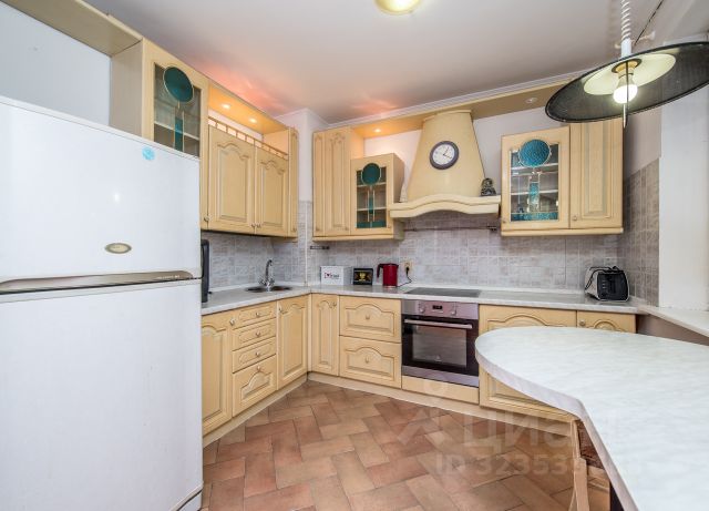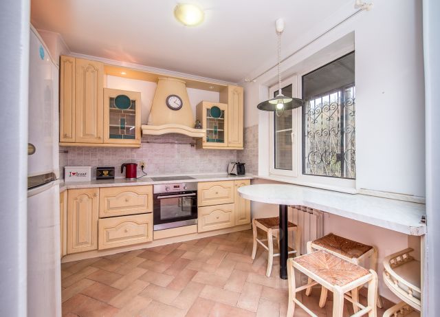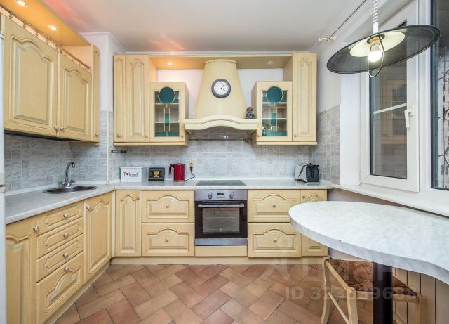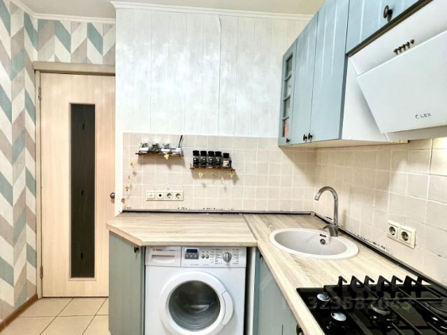Из техники — встроенные холодильник, СВЧ, духовой шкаф, ПММ, вытяжка, стеклокерамическая варочная поверхность, стиральная машина.