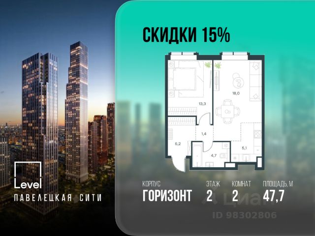 В Даниловском районе столицы (ЮАО) продаётся 3-комнатная квартира площадью 56.80 кв.м без отделки. Квартира расположена на 2 этаже 45-этажного корпуса 'Горизонт' в жилом комплексе бизнес-класса Павелецкая Сити. Высота потолков 3.00м. Престижная локация "Павелецкая Сити" - жилой комплекс бизнес-класса, расположенный в престижном Даниловском районе Москвы, на границе с ЦАО. Проект находится в историческом центре города в окружении парков, Москвы-реки и сформированной инфраструктуры. В пределах 20 минут пешком есть 3 станции метро, а в 5 минутах езды на авто - ТТК и Садовое кольцо. - 15 мин. пешком до метро "Павелецкая"; - 20 мин. пешком до станций "Тульская" и "Серпуховская"; - 8 мин. на авто до Кремля; - 10 мин. на авто до парка Горького и парка "Зарядье"; - 20 мин. на авто до башен "Москва-Сити". Авторская архитектура Архитектурная концепция разработана бюро СПИЧ по индивидуальному проекту. Облик корпусов I и II очередей отсылает к стилистике архитектуры классического Нью-Йорка и золотой эпохи Голливуда. Корпуса IV очереди вдохновлён эстетикой ар-деко в её современном переосмыслении. Благодаря линейному расположению корпусов из большинства квартир будут открываться потрясающие виды на исторический центр города и Москву-реку. Дизайнерские лобби Изысканные интерьеры лобби жилого комплекса отсылают к классическим фильмам золотой эпохи Голливуда. Классика в "Павелецкая Сити" - не имитация, а современное осмысление лучшего в этом стиле. В каждом вестибюле оборудованы стойки ресепшен, комфортные зоны ожидания, гостевые санузлы, мойки для лап животных, колясочные. В корпусах по 3-4 лифта, включая сервисный, с прямым доступом в паркинг. Площадь лобби - от 47,9 до 114,9 кв. м, высота потолков - до 5,46 м. Благоустройство и инфраструктура Для создания благоустройства было приглашено 2 ведущих бюро - ADM и GAFA. Разноуровневое пространство вмещает всё необходимое для качественного досуга: игровые площадки для детей всех возрастов, тропы здоровья для пеших прогулок, крытые аллеи с качелями, места для работы на свежем воздухе, многофункциональные спортивные площадки - воркаут-зоны, столы для пинг-понга, зоны командных игр. Общая площадь закрытого двора - 4,63 га. Комфорт - это когда рядом всё, что нужно для жизни. На первых этажах и в стилобатной части корпусов "Павелецкая Сити" размещены 85 коммерческих помещений, где откроются супермаркеты, кафе, пекарни, аптеки и другие службы сервиса. В составе проекта также предусмотрены собственный фитнес-клуб и развивающий центр Letovo Kids, а также школа на 720 мест и детский сад на 175 мест. Технологии и безопасность - Wi-Fi в лобби и на придомовой территории; - Автоматизированная система контроля и учета ресурсов; - Круглосуточное видеонаблюдение и охрана; - Круглосуточная связь с охраной через приложение, телефон или кол-центр; - Контроль доступа по биометрической системе Face-ID; - Усиленный сотовый сигнал в лифтах и паркинге; - Распознавание номеров автомобилей при въезде/выезде в/из паркинга.
