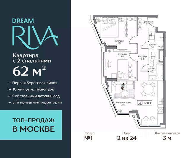 Увеличенный объем панорамного остекления создает неповторимое ощущения воздушности пространства! Двор-набережная с видами на гладь реки и кроны деревьев. Премиальный квартал DREAM RIVA — авторская архитектура в курортной концепции, воплощающей силу природных стихий в каждой детали оформления и благоустройства. Продаётся Квартира с 2 спальнями квартира на 2 этаже 26-этажного дома (3 корпус). Общая площадь: 64.5 кв.м. Высота потолков от 3 м. Формат приватного досуга и эксклюзивные привилегии в DREAM RIVA с приоритетным доступом для резидентов: - Первая линия Москвы-реки с открытыми видами на воду и город; - 3 Га приватного прибрежного парка с зонами для спорта и йоги; - Открытый солярий; - Школа и собственный детский сад; - Многофункциональные детские игровые площадки и детское кафе с игровой комнатой; - Клубная гостиная и lounge-бар. Локация вне конкуренции — инфраструктура полуострова предлагает всё, что нужно для размеренной жизни, работы, отдыха и развлечений: - Благоустроенная набережная с гастрогалереей; - Парк аттракционов Остров Мечты (в торговой части: рестораны, кафе, супермаркет, магазины, салон красоты, йога-студия и многое другое); - 44 Га ландшафтных парков для прогулок, спорта, пикников; - Пляжный комплекс Dream Beach Club со множеством бассейнов, ресторанов, баров и развлечений для любого возраста; - Яхт-клуб; - Вейк-парк; - Кинотеатр под открытым небом и многое другое. Удобная транспортная доступность: - Центр рядом: 15 минут до Садового кольца на авто, 20 минут до Сити или Кремля; - В 5 минутах прогулочным шагом — станция метро "Технопарк"; - Южный речной вокзал. Наши менеджеры будут рады провести для Вас консультацию и подробнее рассказать о проекте. Успейте купить на лучших условиях!
