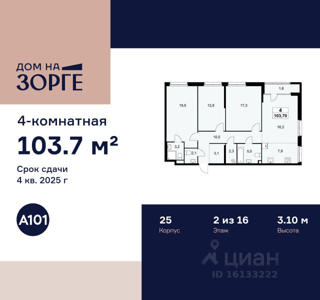 Продается двухкомнатная квартира 3 в новостройке ЖК "Дом на Зорге" по адресу Москва, САО, Сокол, улица Зорге, 25с2, Москва, 125252. Общая площадь квартиры - 47.90 кв. м., этаж 2 из 16, секция 1. Тип проекта, по которому построен дом - монолит, компания-застройщик - ООО "А101". Стоимость квартиры - 27696307 Р. Срок сдачи - 4 квартал 2025. ПРЕДЛОЖЕНИЯ ОТ ЗАСТРОЙЩИКА В НОЯБРЕ 2025: Ипотека от 13,9 % для всех! На весь срок. "Семейная ипотека" вернулась. Ставка от 3,5 % на весь срок! Без удорожания! Выгодное ипотечное комбо: Ипотека от 2200 р./мес. и от 6 % после рождения ребёнка! Ипотека для всех "Держи пять!" - ставка 5 % на 2 года! *более подробную информацию по скидкам и акциям уточняйте в отделе продаж Дом на Зорге" - жилой комплекс бизнес-класса в историческом районе Москвы со сложившейся инфраструктурой.Корпуса переменной этажности с элегантными монохромными фасадами гармонично вписаны в статусное окружение. Архитектурно-художественная подсветка подчеркнёт изысканные очертания дома.В приватном и тихом дворовом пространстве появится фонтан со слэбами натуральных камней, детские площадки, места для настольных игр и спокойного отдыха. Безопасность обеспечат видеонаблюдение, центральный пост охраны и система контроля доступа. Округ, где строится "Дом на Зорге" (САО), известен ведущими медицинскими центрами страны, престижными учебными заведениями (включая школы), спорткомплексами, бизнес-центрами. В лобби с дизайнерской отделкой предусмотрены круглосуточный консьерж-сервис, колясочные, зоны ожидания, аппараты для чистки обуви. Подземный 2-уровневый паркинг оснащён системой автоматического распознавания номеров. Всего в 350 м - станция метро "Зорге". До "сердца" столицы - 11 км. Преимущества "Дома на Зорге" - престижная локация с развитой инфраструктурой - 350 м от станции метро (МЦК) "Зорге" - закрытый приватный двор с уникальным благоустройством