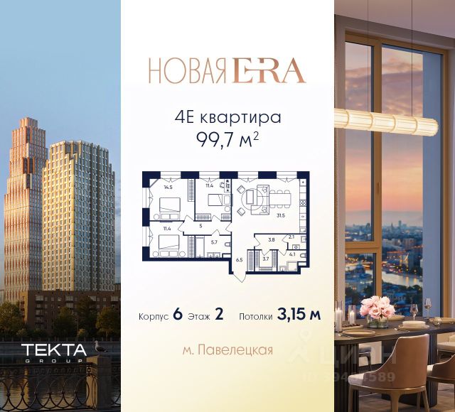 В Даниловском районе столицы (ЮАО) продаётся 3-комнатная квартира площадью 57.70 кв.м без отделки. Квартира расположена на 2 этаже 27-этажного корпуса 'Горизонт' в жилом комплексе бизнес-класса Павелецкая Сити. Высота потолков 3.00м. Престижная локация "Павелецкая Сити" - жилой комплекс бизнес-класса, расположенный в престижном Даниловском районе Москвы, на границе с ЦАО. Проект находится в историческом центре города в окружении парков, Москвы-реки и сформированной инфраструктуры. В пределах 20 минут пешком есть 3 станции метро, а в 5 минутах езды на авто - ТТК и Садовое кольцо. - 15 мин. пешком до метро "Павелецкая"; - 20 мин. пешком до станций "Тульская" и "Серпуховская"; - 8 мин. на авто до Кремля; - 10 мин. на авто до парка Горького и парка "Зарядье"; - 20 мин. на авто до башен "Москва-Сити". Авторская архитектура Архитектурная концепция разработана бюро СПИЧ по индивидуальному проекту. Облик корпусов I и II очередей отсылает к стилистике архитектуры классического Нью-Йорка и золотой эпохи Голливуда. Корпуса IV очереди вдохновлён эстетикой ар-деко в её современном переосмыслении. Благодаря линейному расположению корпусов из большинства квартир будут открываться потрясающие виды на исторический центр города и Москву-реку. Дизайнерские лобби Изысканные интерьеры лобби жилого комплекса отсылают к классическим фильмам золотой эпохи Голливуда. Классика в "Павелецкая Сити" - не имитация, а современное осмысление лучшего в этом стиле. В каждом вестибюле оборудованы стойки ресепшен, комфортные зоны ожидания, гостевые санузлы, мойки для лап животных, колясочные. В корпусах по 3-4 лифта, включая сервисный, с прямым доступом в паркинг. Площадь лобби - от 47,9 до 114,9 кв. м, высота потолков - до 5,46 м. Благоустройство и инфраструктура Для создания благоустройства было приглашено 2 ведущих бюро - ADM и GAFA. Разноуровневое пространство вмещает всё необходимое для качественного досуга: игровые площадки для детей всех возрастов, тропы здоровья для пеших прогулок, крытые аллеи с качелями, места для работы на свежем воздухе, многофункциональные спортивные площадки - воркаут-зоны, столы для пинг-понга, зоны командных игр. Общая площадь закрытого двора - 4,63 га. Комфорт - это когда рядом всё, что нужно для жизни. На первых этажах и в стилобатной части корпусов "Павелецкая Сити" размещены 85 коммерческих помещений, где откроются супермаркеты, кафе, пекарни, аптеки и другие службы сервиса. В составе проекта также предусмотрены собственный фитнес-клуб и развивающий центр Letovo Kids, а также школа на 720 мест и детский сад на 175 мест. Технологии и безопасность - Wi-Fi в лобби и на придомовой территории; - Автоматизированная система контроля и учета ресурсов; - Круглосуточное видеонаблюдение и охрана; - Круглосуточная связь с охраной через приложение, телефон или кол-центр; - Контроль доступа по биометрической системе Face-ID; - Усиленный сотовый сигнал в лифтах и паркинге; - Распознавание номеров автомобилей при въезде/выезде в/из паркинга.